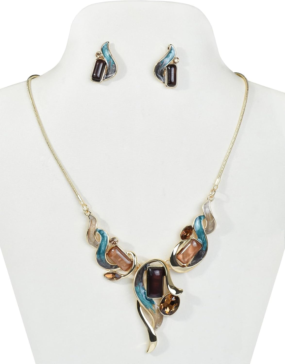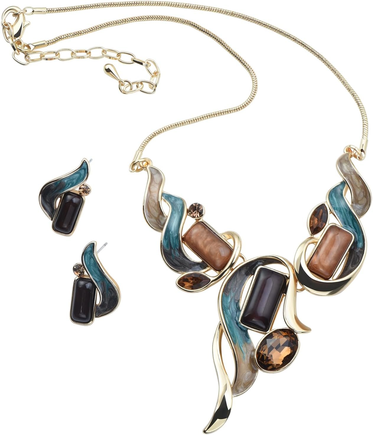 Retro Women’s Crystal Floral Petal Leaf Chunky Statement Necklace and Earrings Set Party Jewelry