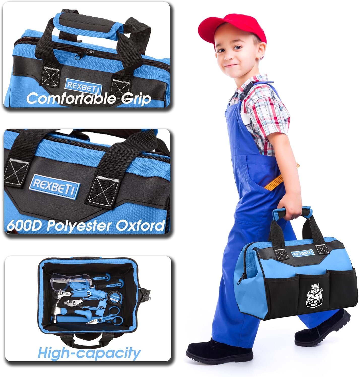 REXBETI 10-Piece Kids Tool Set with Real Hand Tools, Blue Durable Storage Bag, Children Learning Tool Kit for Home DIY and Woodworking