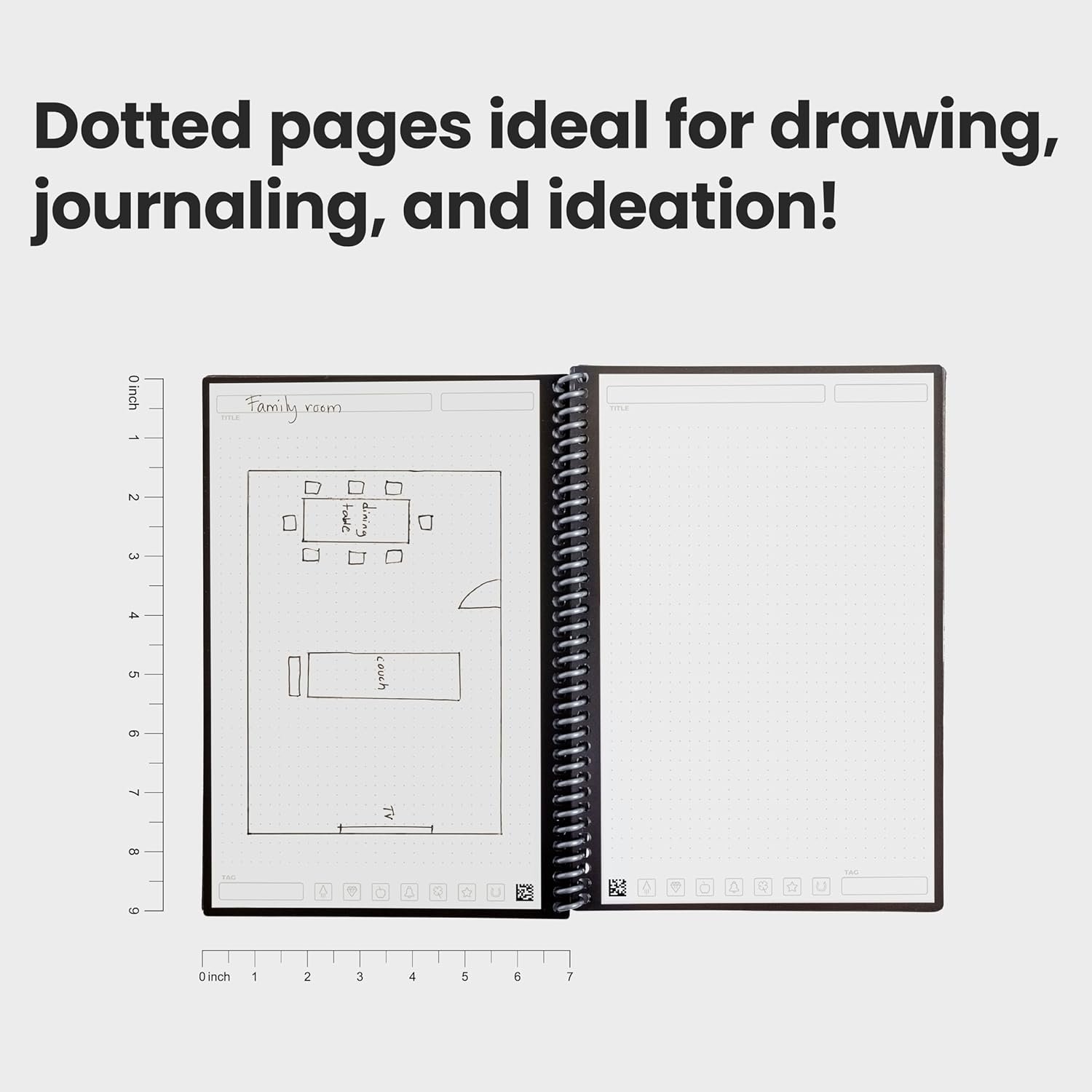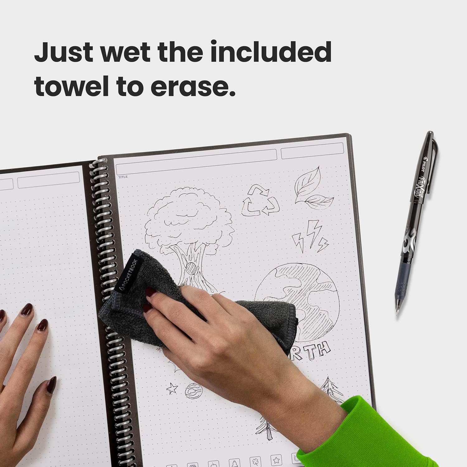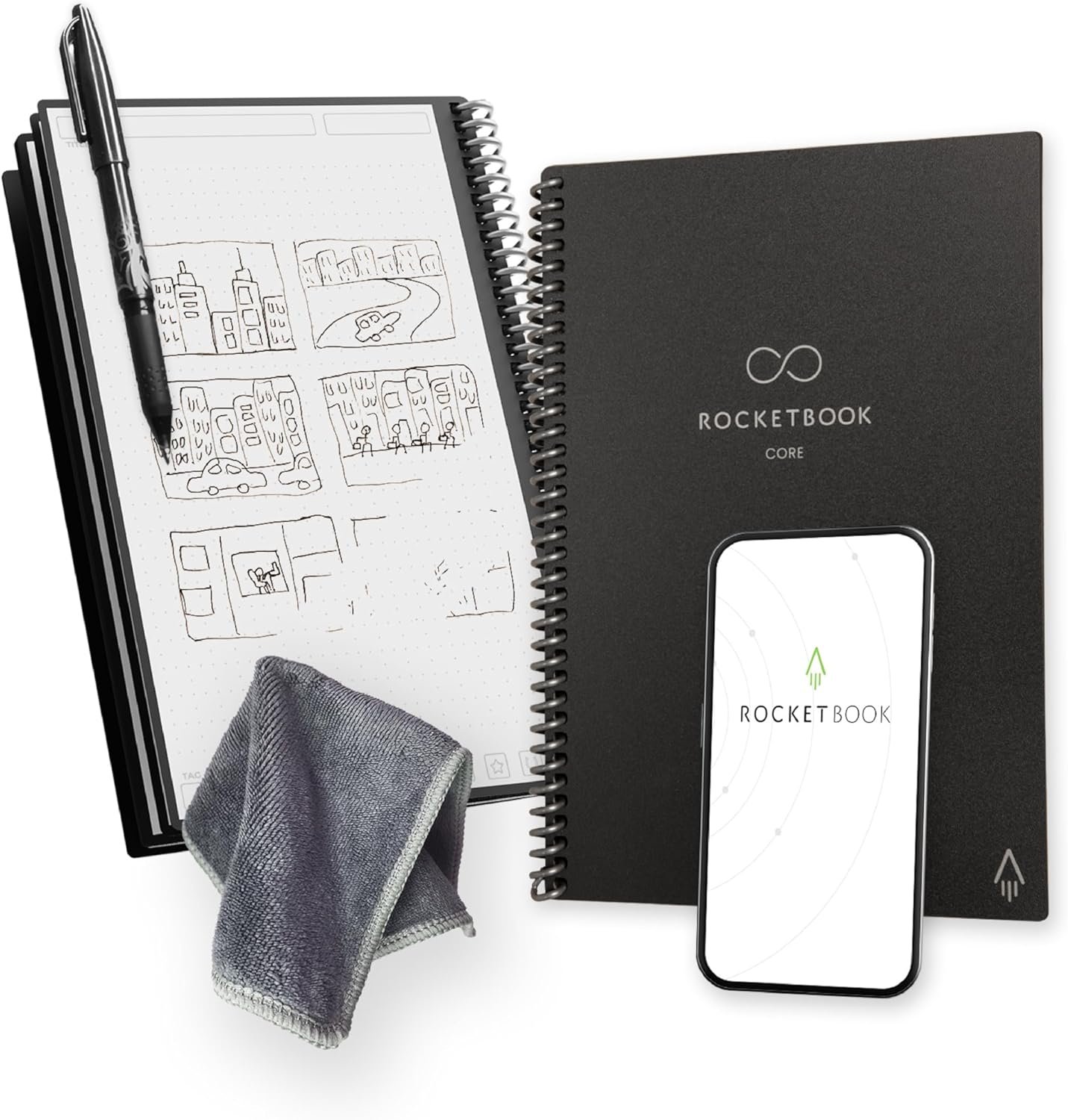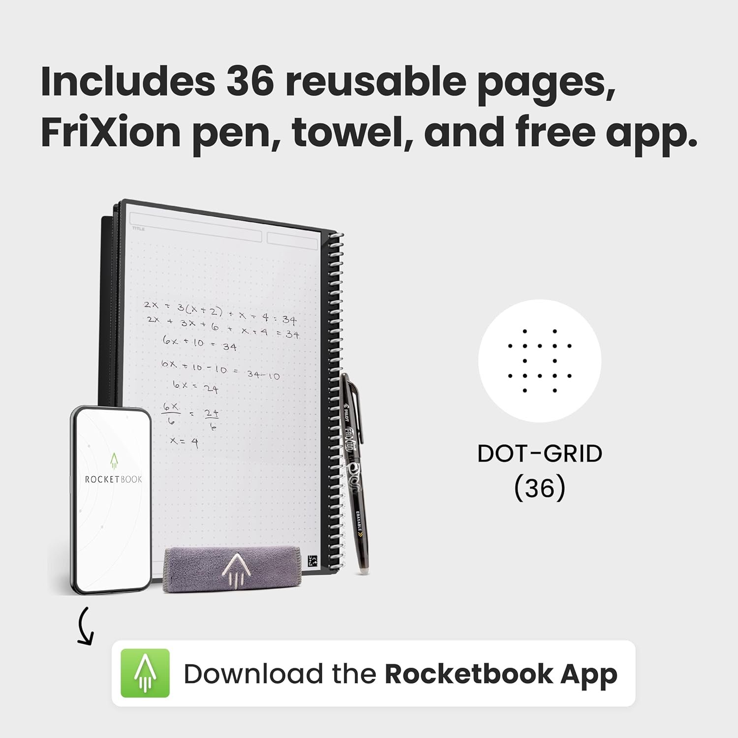 New and Improved Core: Features premium reusable paper, with improved pen to paper feel, spiral binding and sleekly re-designed, scratch-resistant cover. Grid layout pages now include Smart Titles and Smart Tags to name and organize files efficiently.Create, Digitize, Erase, Re-Create: Capture ideas with the included Pilot Frixion Pen, digitize effortlessly using the Rocketbook app, store in your preferred cloud service. When done, simply wipe the pages clean with a damp cloth and start fresh.