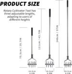 【Long Handle Design】: Tiller for gardening has an adjustable handle: 29.7 inches, 43.7 inches, 57 inches, ergonomically designed and easy to hold, allowing you to easily cultivate without back strain or pain. The stable grip ensures comfort, allowing you to work for a long time without discomfort. You can freely adjust the size according to your needs.