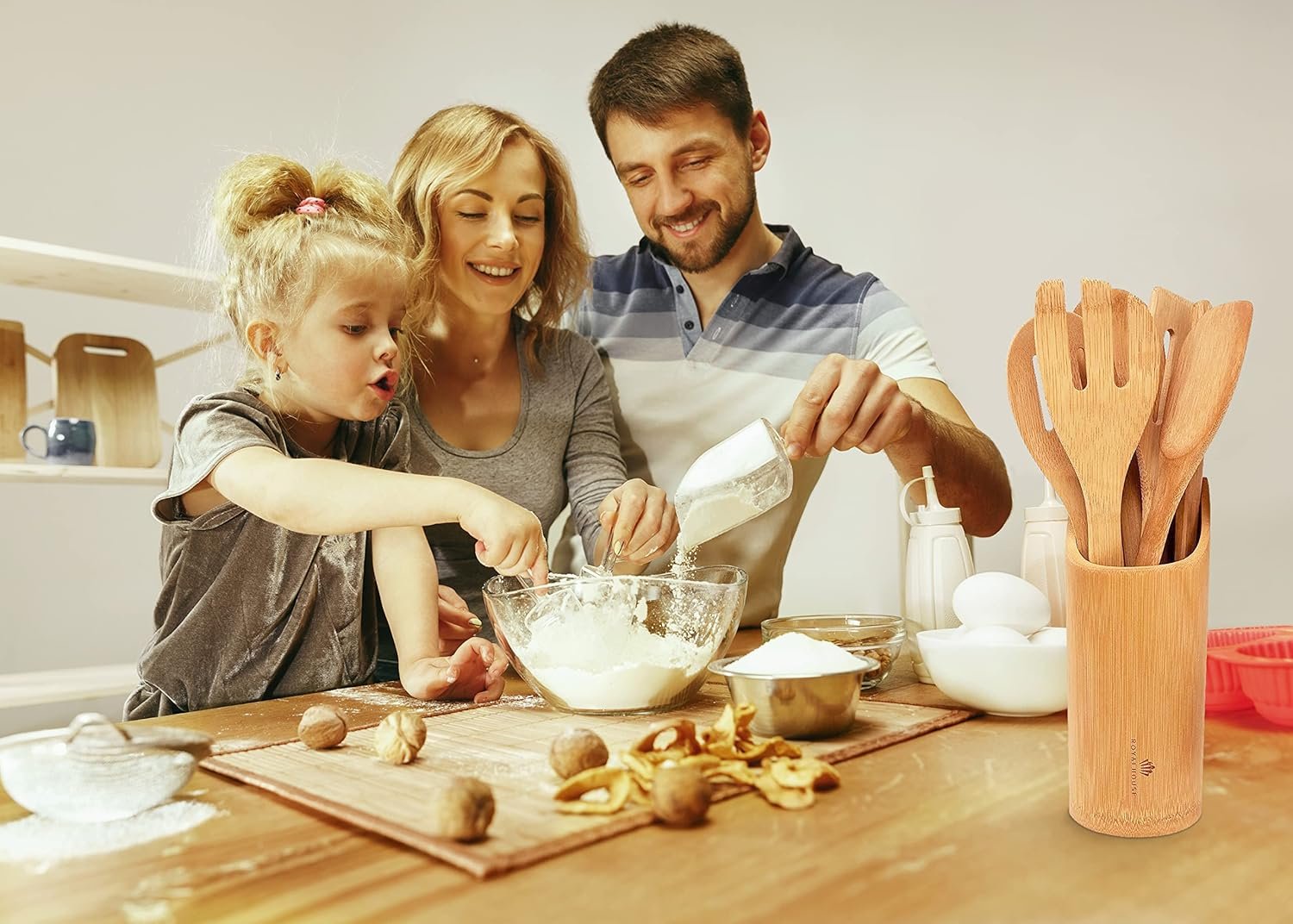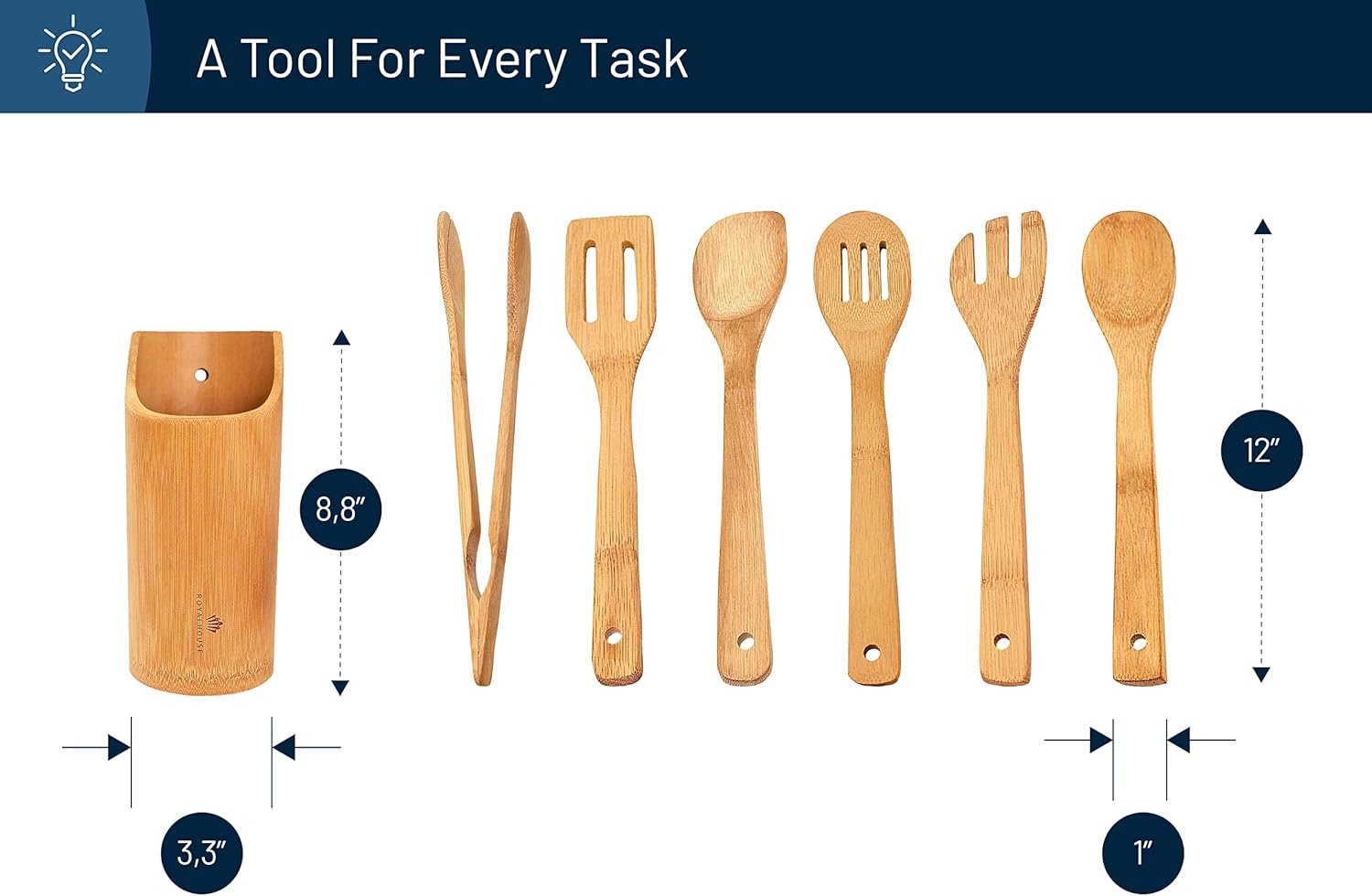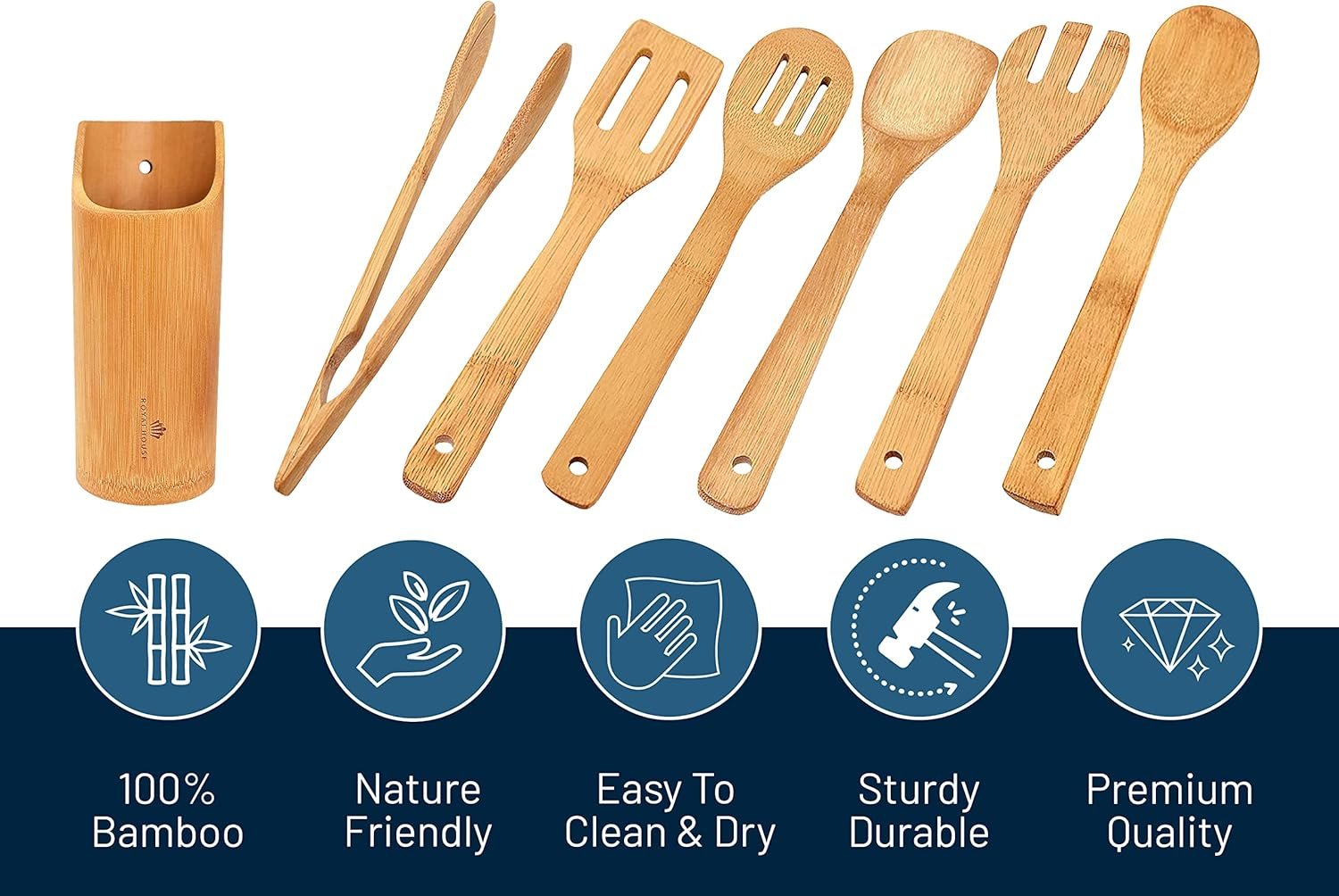 RoyalHouse Wooden Kitchen Utensils Set, 7 Piece Bamboo Cooking Tools and Holder Cooking Spoons and Spatulas, Kitchen Tools, Wood Tool Utensil Sets for Nonstick Pan and Cookware