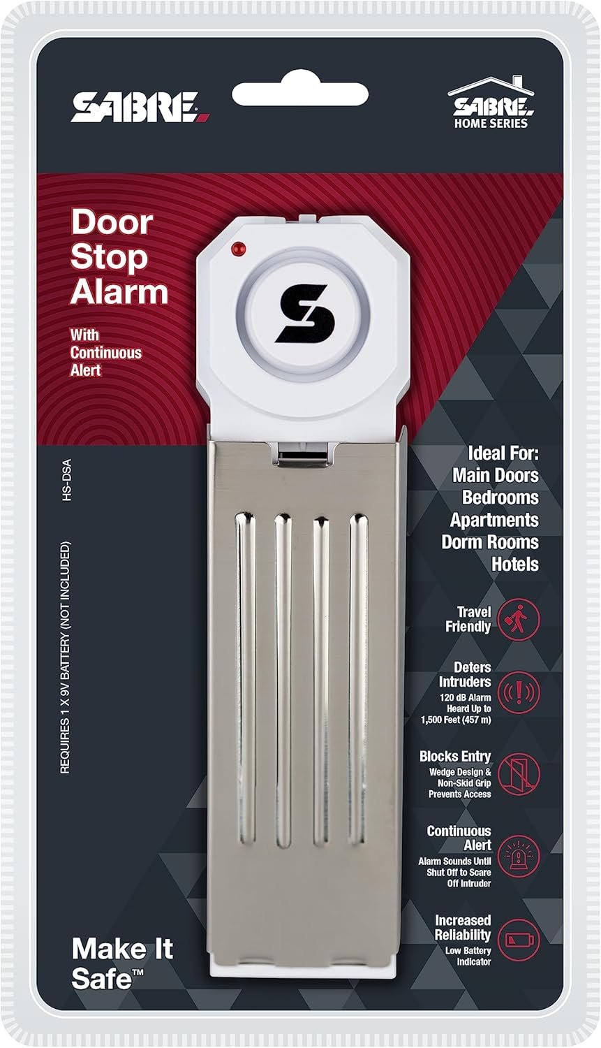 A burglary occurs every 14.5 seconds in the U.S., and budget cuts have led to an average 911 response time of 10 minutes. Furthermore, without the ability to install a home security system, renters and travelers can have a hard time feeling secure in their temporary housing. SABRE’s Door Stop Alarm is a great solution to either help fortify an existing home alarm system or use on its own in a bedroom, dorm, hotel room or apartment. The extremely 120dB loud alarm is audible up to 1,500-feet (455-meters) away and sounds when door pressure is applied. It is compatible with doors that have a 0.75″ gap between the floor and bottom of door (if the gap is greater, the alarm will not be able to activate when the door is opened). The alarm is coupled with a non-skid pad to prevent the door from opening. This attractive, premium white alarm installs easily in just seconds – simply slide it under the crack of an inward-swinging door. There’s no wiring needed, so the alarm works during power outages. Requires 1x9V battery (not included). A small Philips Head #1 size screwdriver is required to remove battery compartment cover. For an extra level of security, the Door Stop Alarm provides a battery status update via a low battery indicator. The Door Stop Alarm was developed by SABRE, the #1 pepper spray brand trusted by police and consumers worldwide, meaning this product is extremely reliable. Backed by over 45 years in the security industry, SABRE products must pass rigorous quality assurance testing before leaving our facilities to give you peace of mind. Improve your home security today.