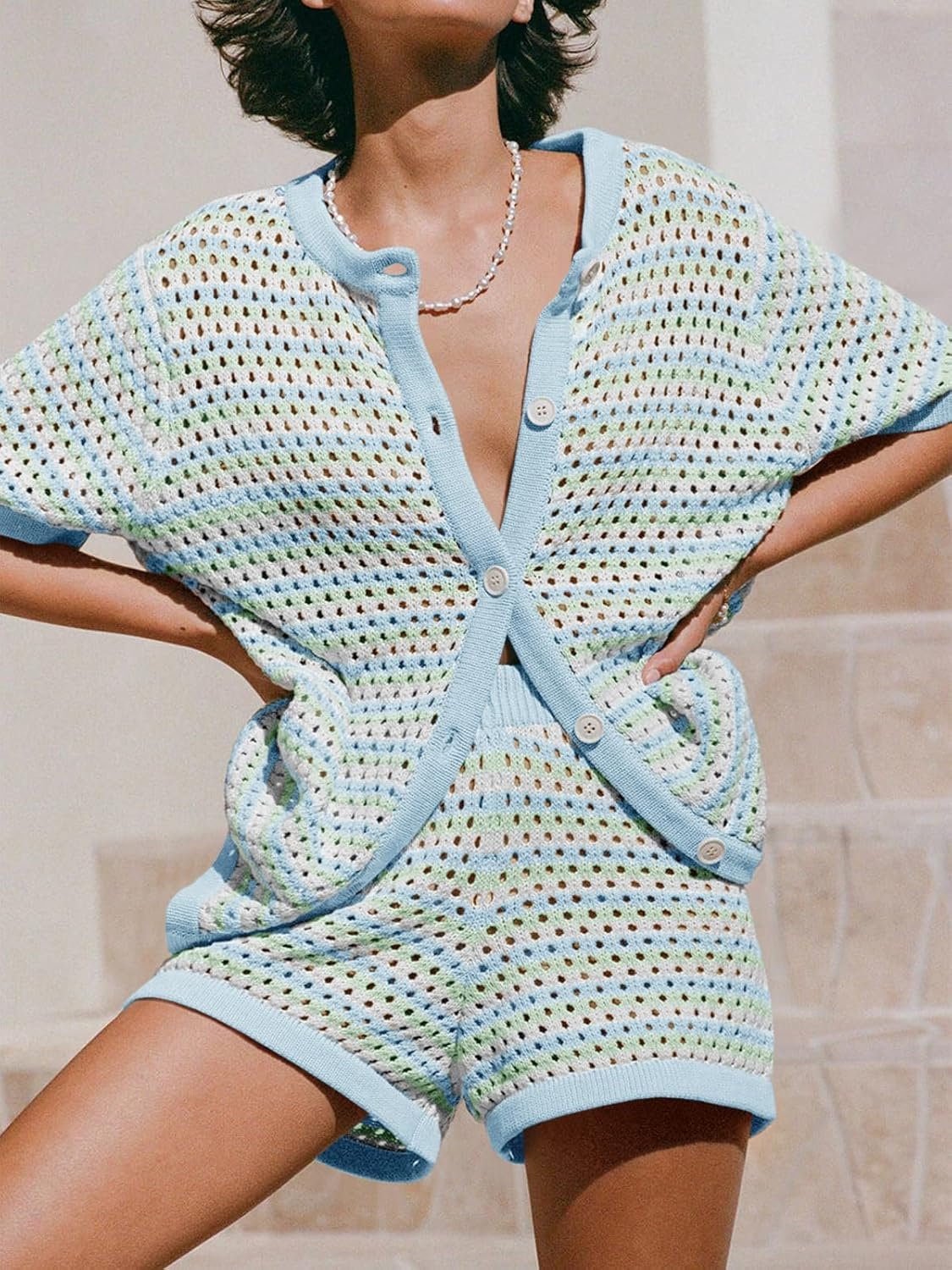 Saodimallsu Womens Crochet Swimsuit Coverup Summer Beach Sets Striped Knit Short Sleeve Button Shirts 2 Piece Short Set