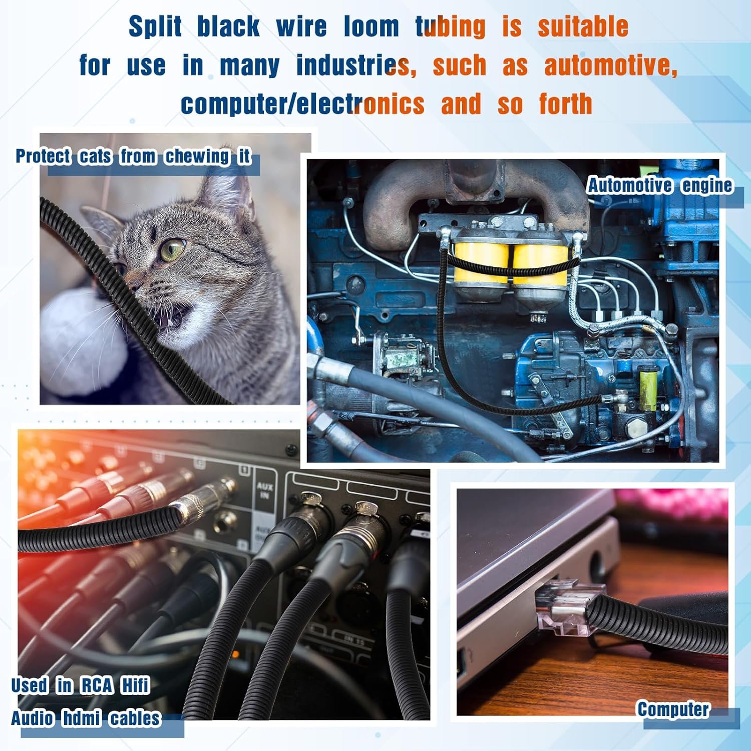 Versatile Application: our split loom tubing serves a broad range of usage, from automotive to marine, from industry wiring protection to home and office use; Its reliable quality makes it an essential tool in automotive engines, electronics, agriculture and construction industries; In addition, it helps protect your pets from chewing on the wires