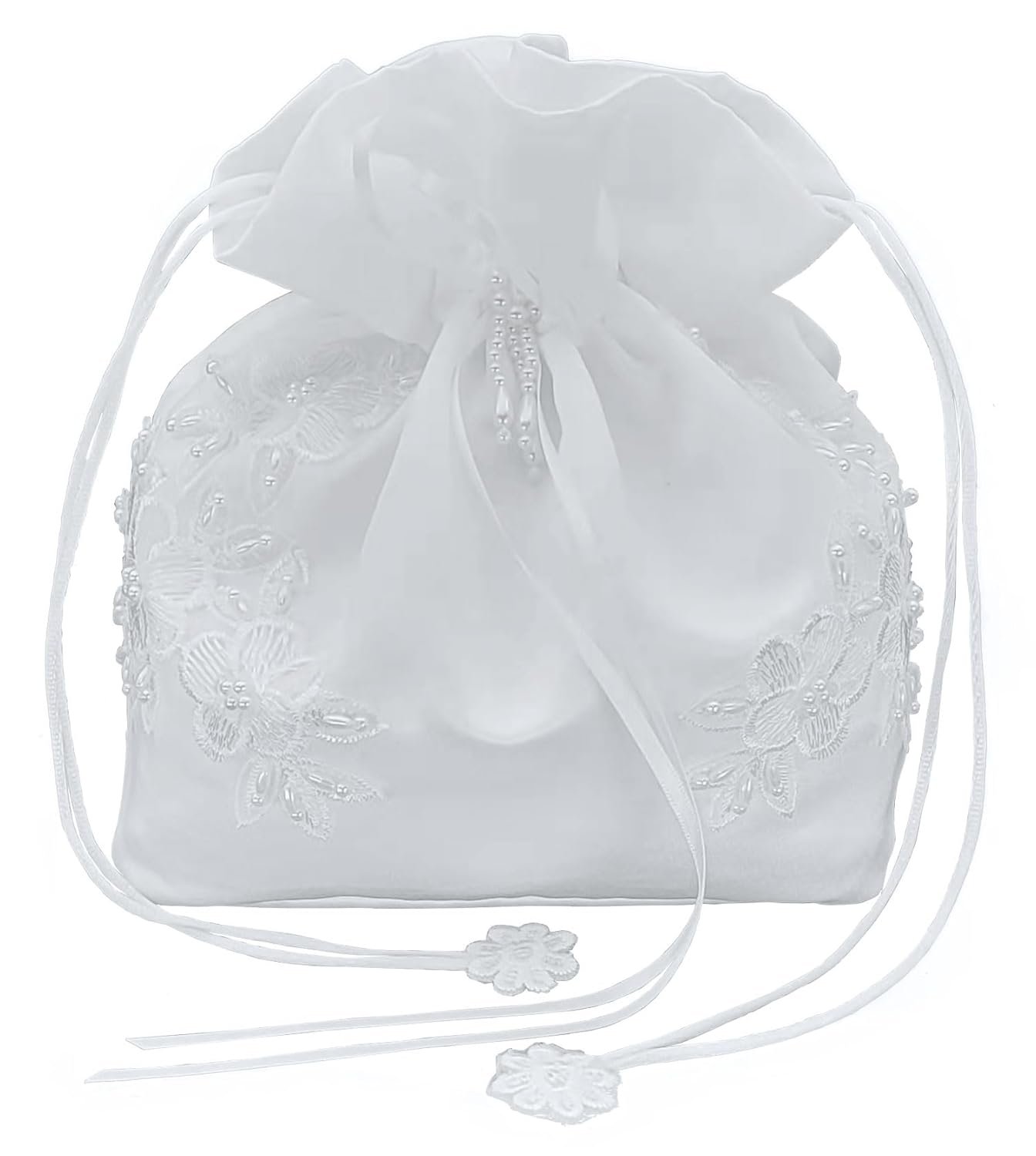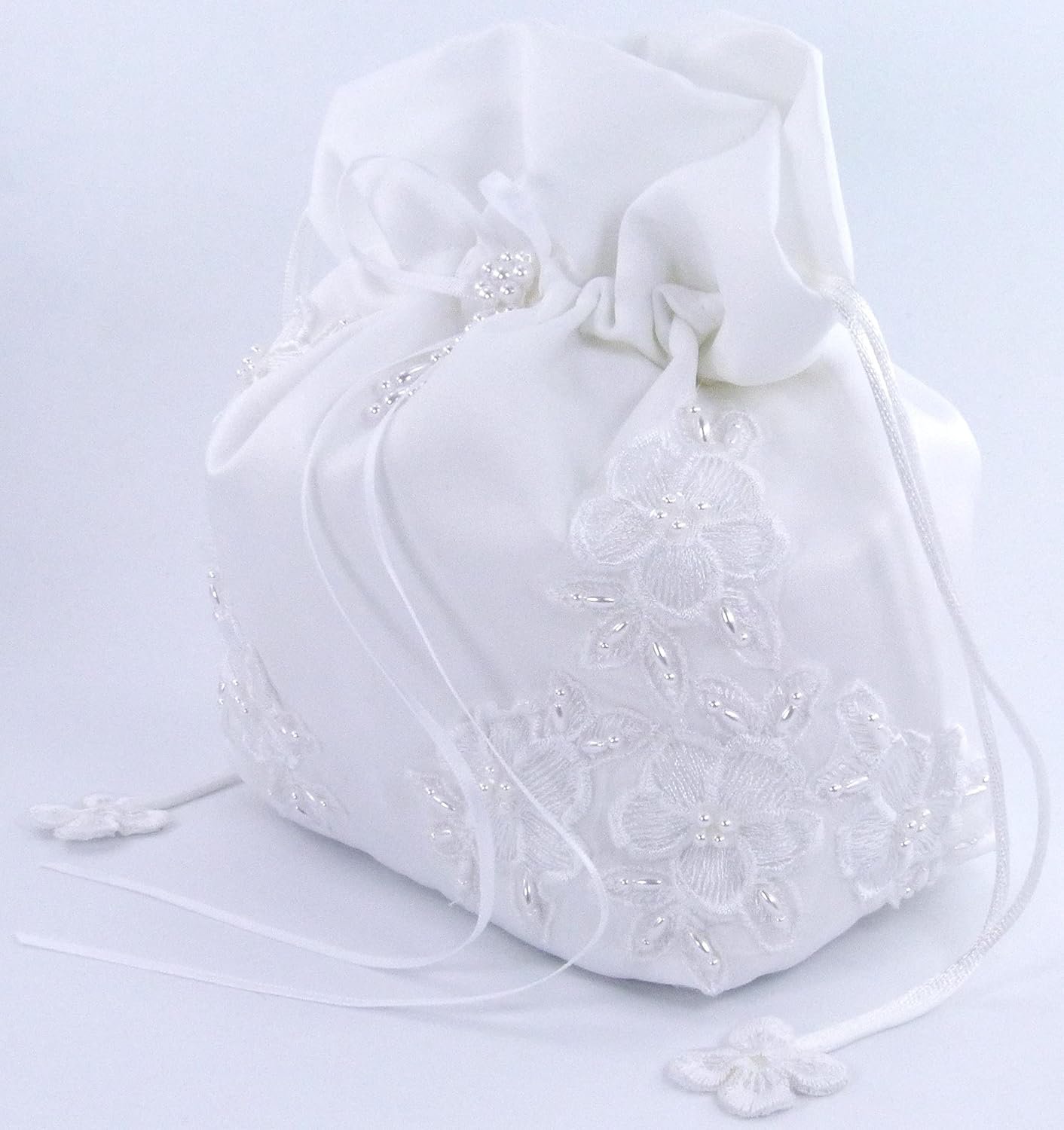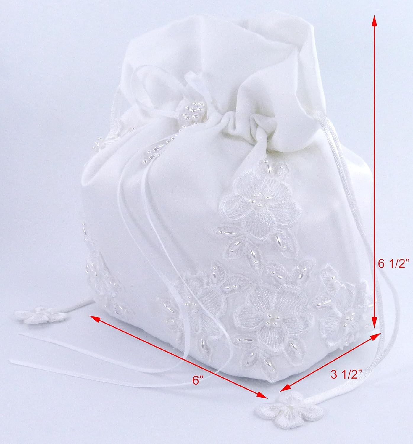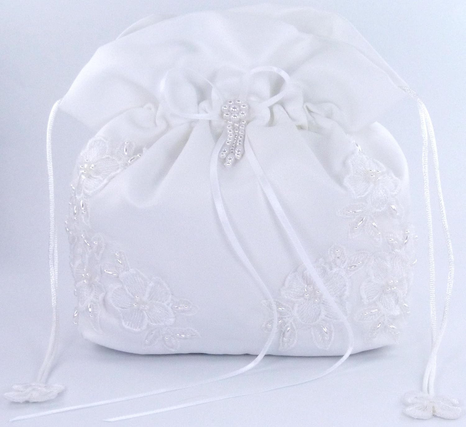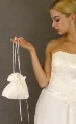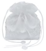 A great touch to your dream wedding, this beautiful bridal bag is made of satin and pearl-beaded lace and satin bow adorned with pearly flower. This bag can be used as a money bag or an elegant purse for the bride. The bag is the perfect size for emergency items that you may want to carry with you on that important day. It measures approximately 7 1/2 x 6″ x 4″. This bag closes with a corded drawstring that is decorated with lace appliques.