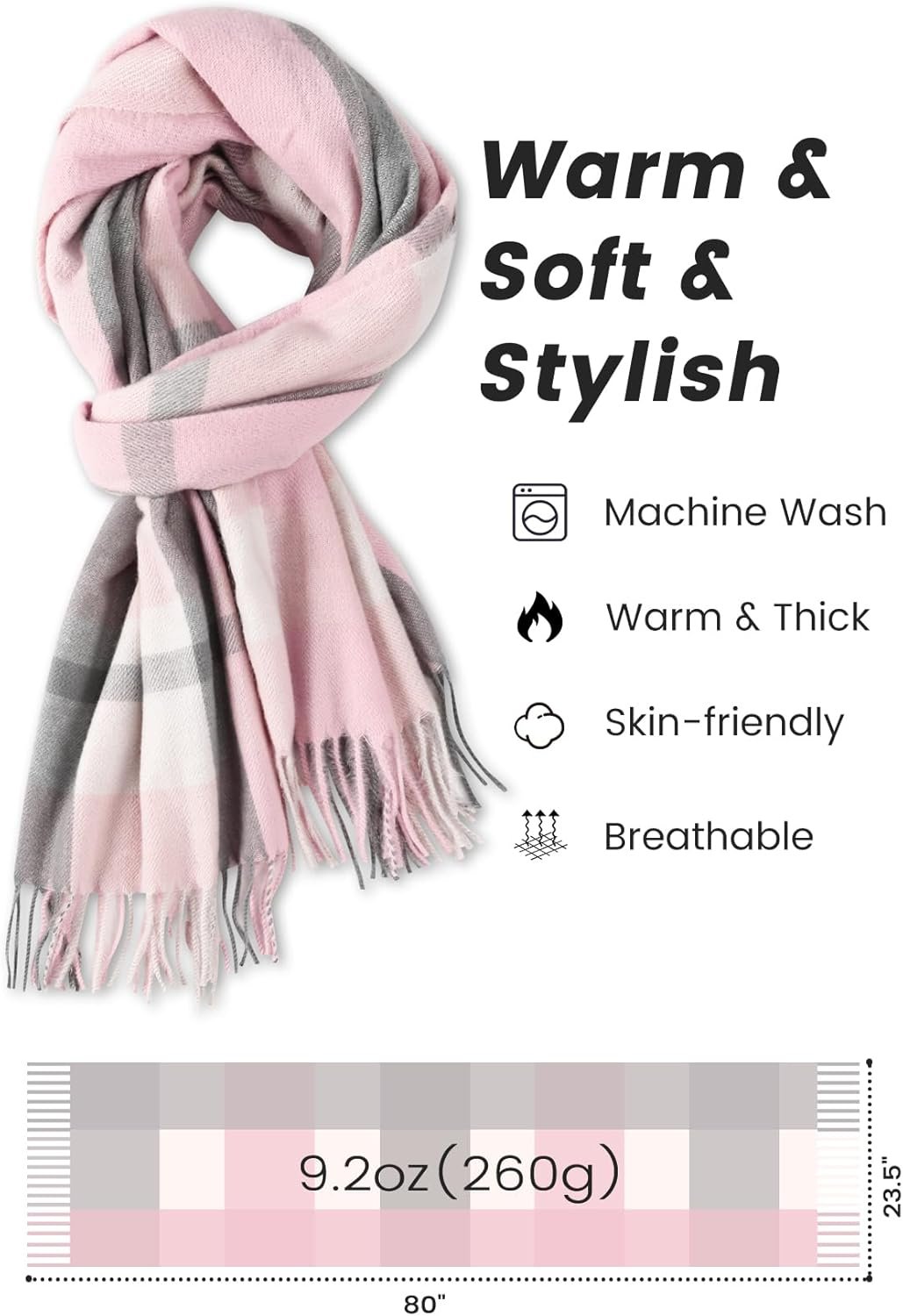 Measures with dimensions: 80″L x 23.5″ W (including the tassel). Scarf for women is large enough for most women and girls. The perfect length makes it possible to wear it in many ways. It also can be wore as a wrap, a blanket and a shawl which can easily match with your outfits.