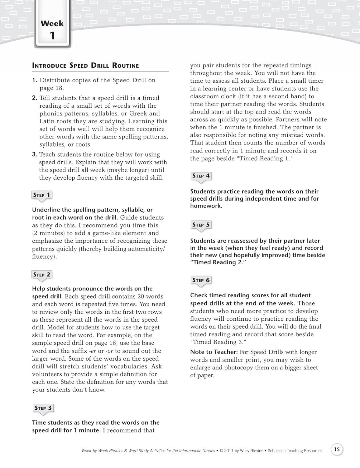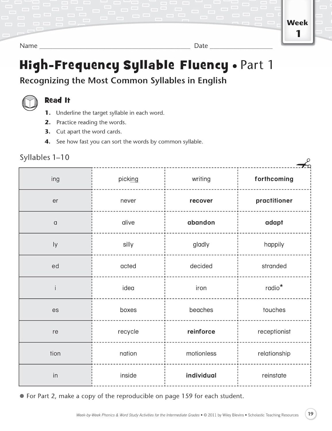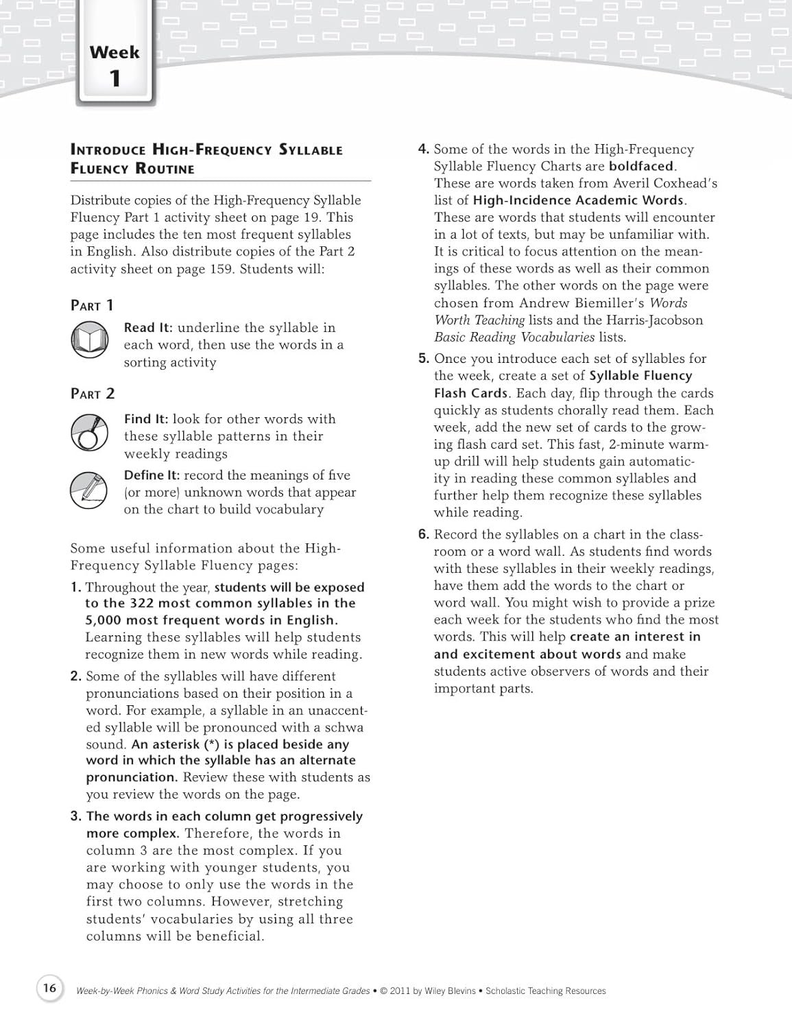 Short, weekly fluency-building activities designed by phonics expert Wiley Blevins give teachers of grades 3 to 6 the tools they need to help struggling readers decode multisyllabic words and read grade-level texts with confidence. Each set of activities includes a skill-building mini-lesson targeting multisyllabic words, follow-up practice pages to help students apply what they ve learned, a speed drill, and an activity that helps students master the top 322 syllables, ten at a time. 160 pages. Grades 3-6
