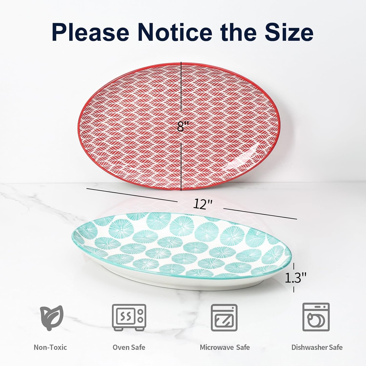 VERSATILE LARGE OVAL PLATTERS – The Width of these 12-Inch oval serving platters measures 8 inch, which works perfectly with any food like fish dish, chips, steaks, sandwiches, appetizers, desserts, etc. They are ideal for Thanksgiving, Christmas, entertaining, dinner or party, family gathering.