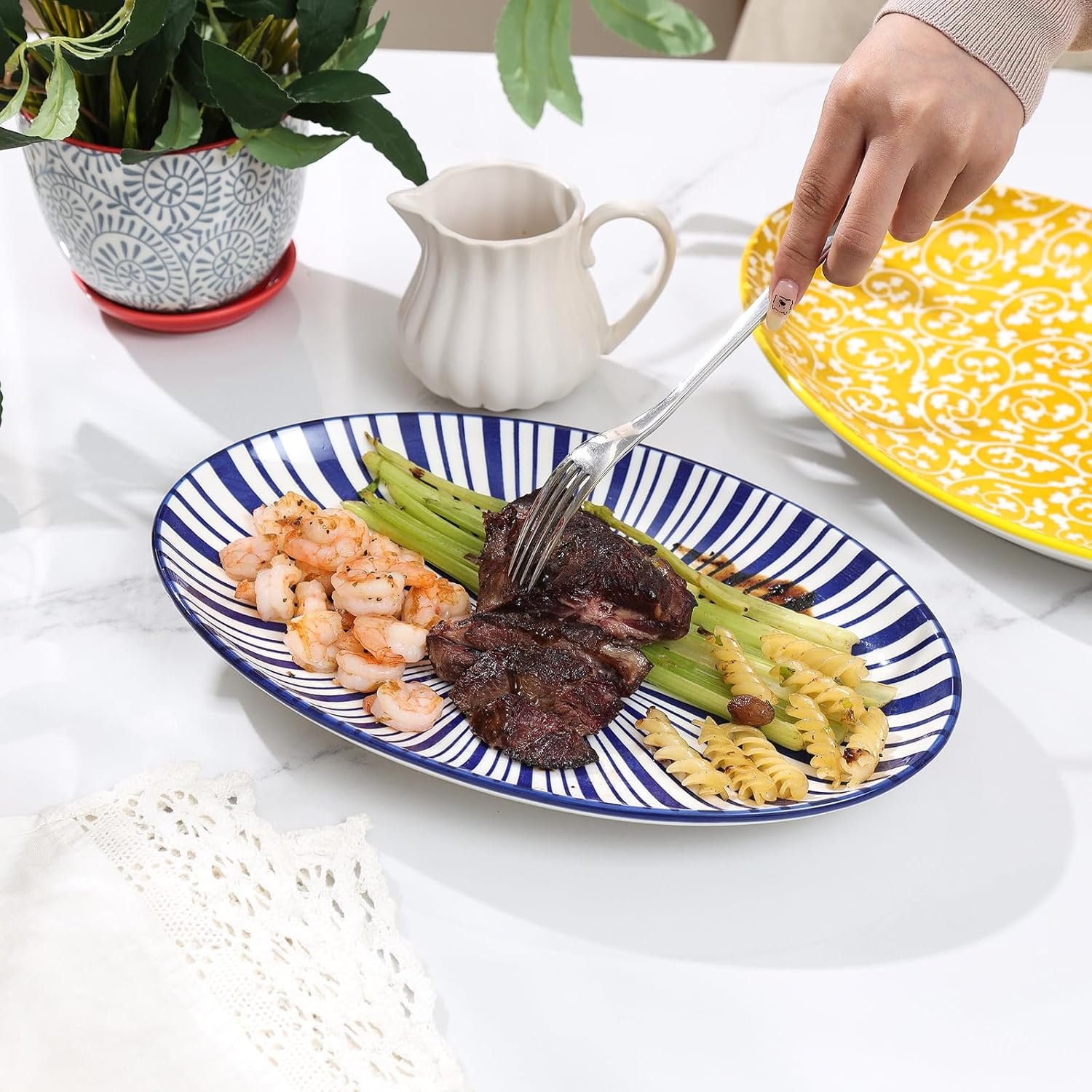 SAVE SPACE & GORGEOUR PRESENT – These oval serving platters are easily stacked without the tilt problem. The delicate appearance makes them an excellent present for your family, friends, and lover. Perfect for leisure time and create an unforgettable memory with them.