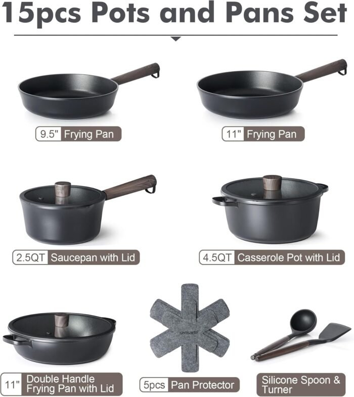 SENSARTE Cookware Set Pots and Pans Set Nonstick Kitchen Cooking Set Non-toxic, Dishwasher & Oven Safe, Induction Compatible, PFOA/PFOS Free, 15pcs, Black