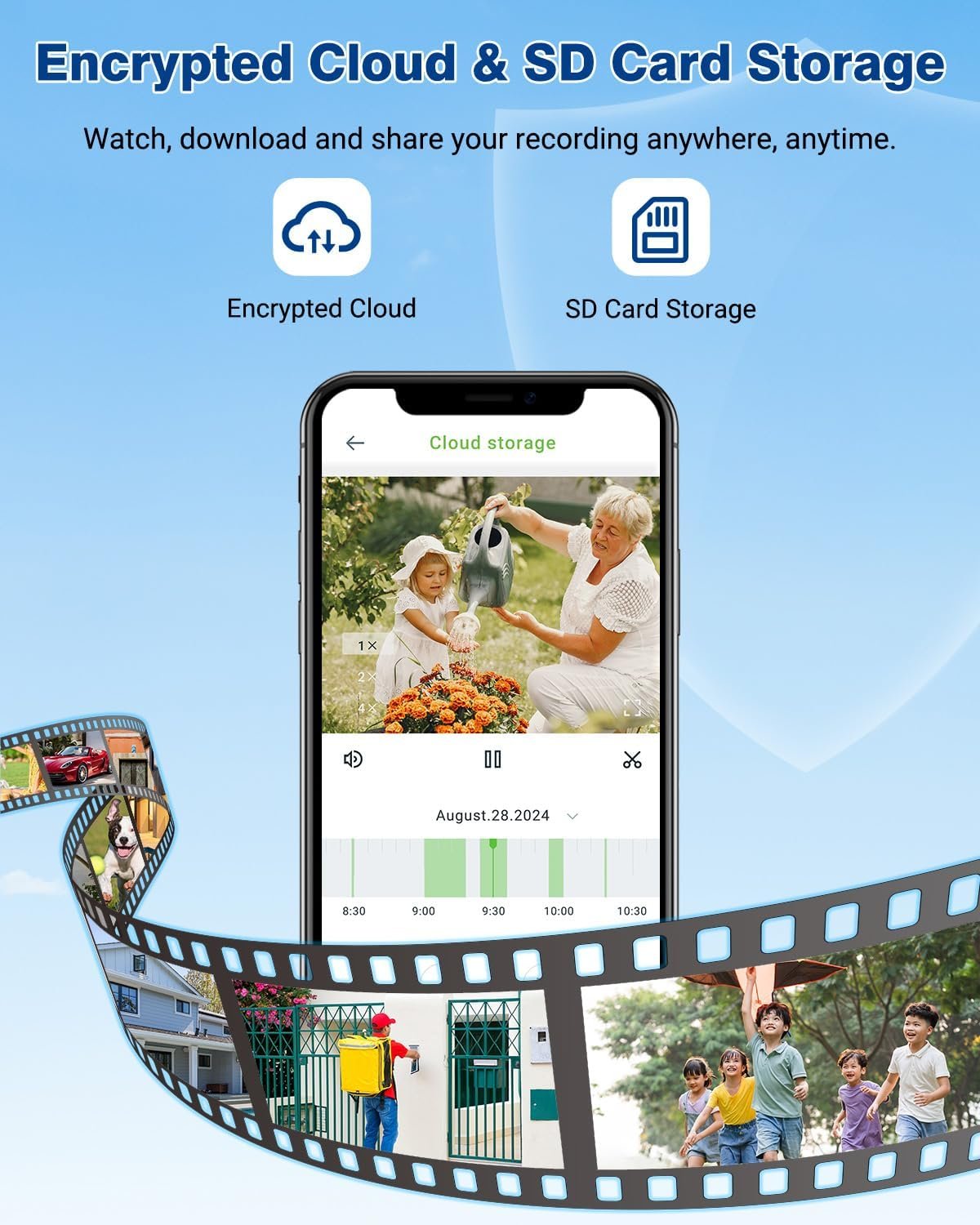 This wireless outdoor security camera supports cloud storage and SD cards (not included). New users get a 30-day cloud storage trial. Choose between convenient cloud storage or flexible local SD storage.