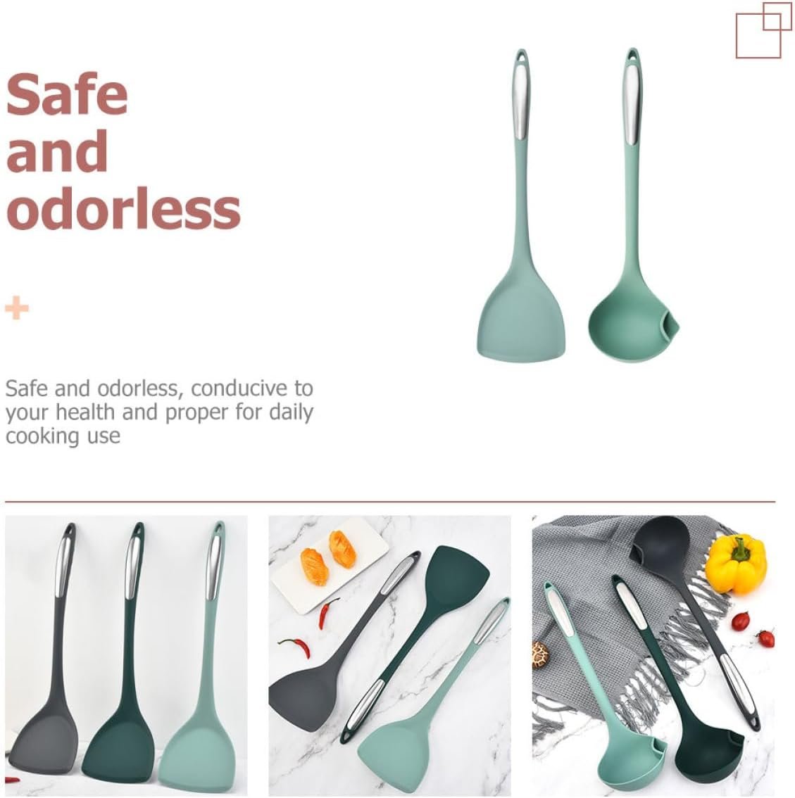 -Material:Nylon, silicone, stainless steel non-slip cookware