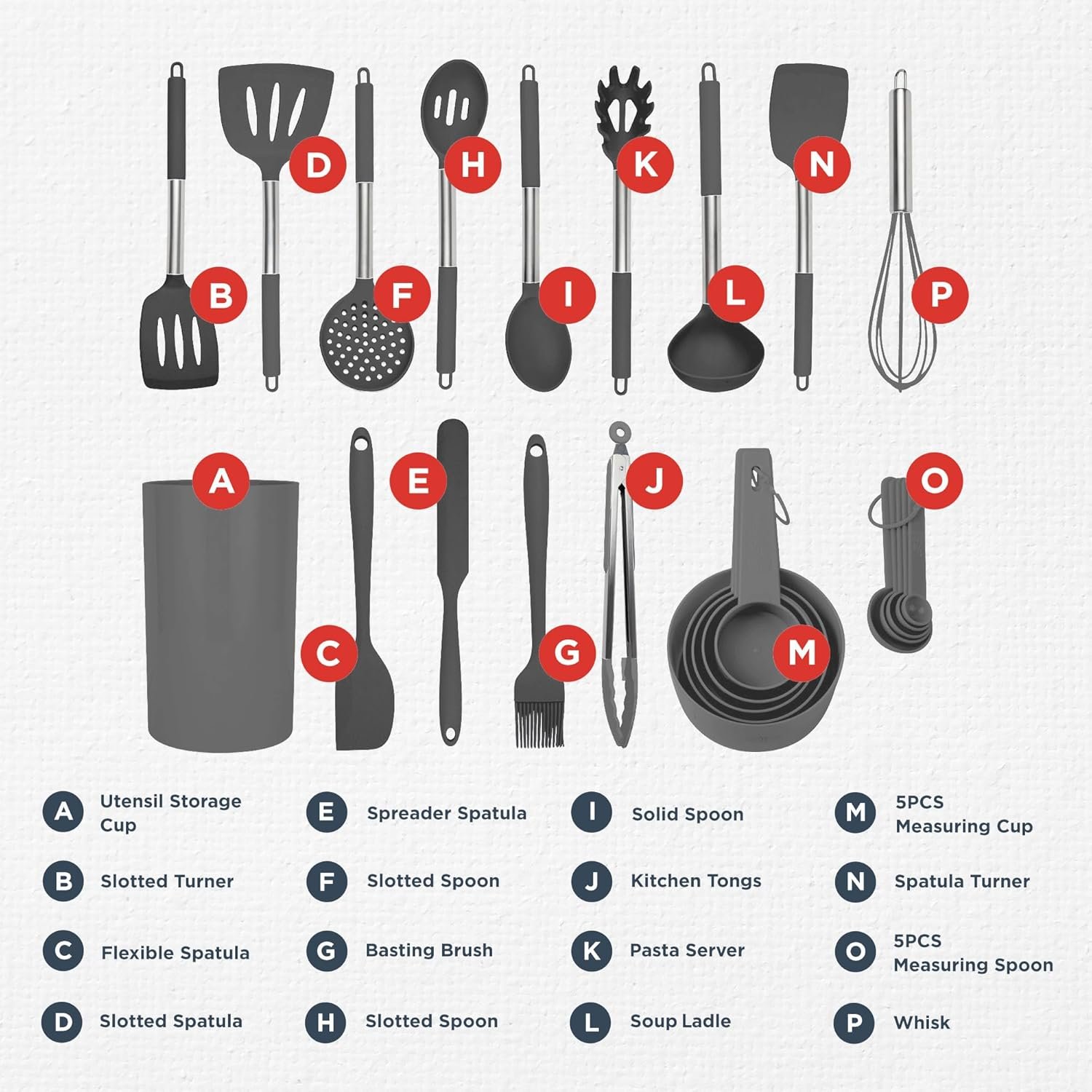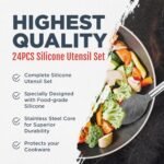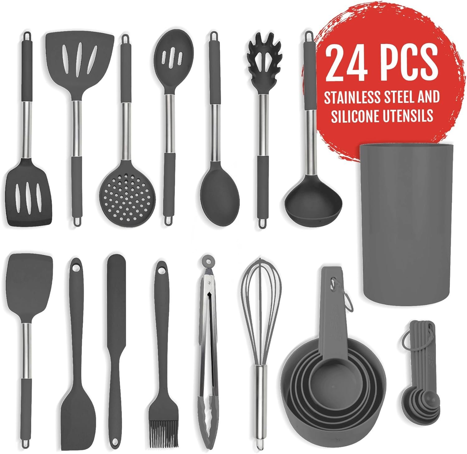 Silicone Kitchen Utensils Set – Culinary Couture 24-Pieces Grey Silicone Cooking Utensils Set for Nonstick Cookware – Silicone Spatulas Set, Stainless Steel Handle & Other Kitchen accessories