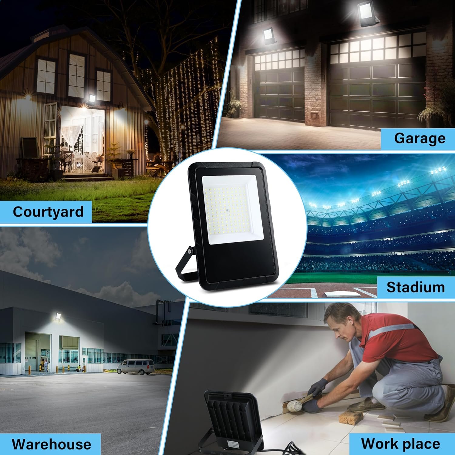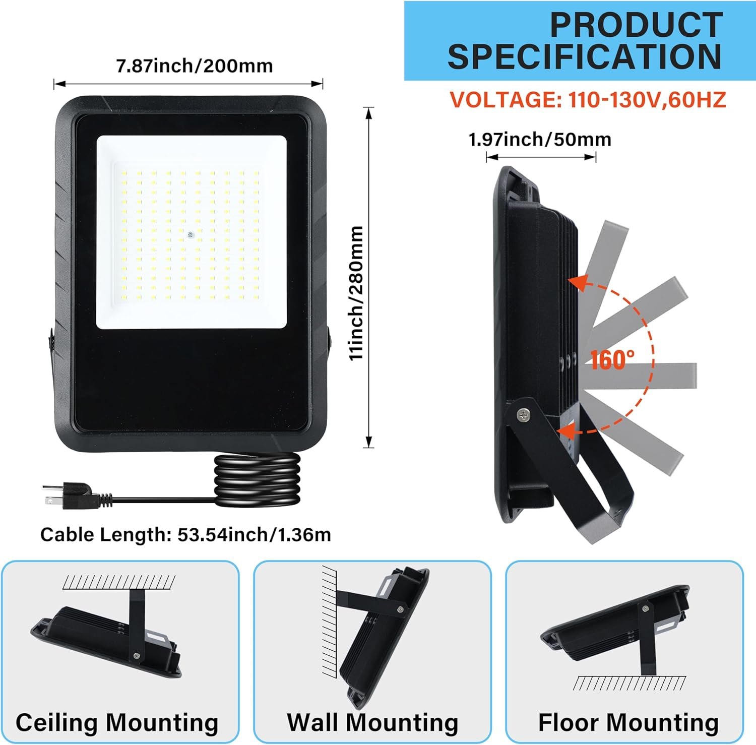Super Bright & Energy Saving: Each floodlight comes with 140 ultra-bright LEDs, producing up to 10000lm 6500K daylight white light, brighter and more energy efficient than traditional halogen lamps. 120° beam angle cover a large area without shadow.