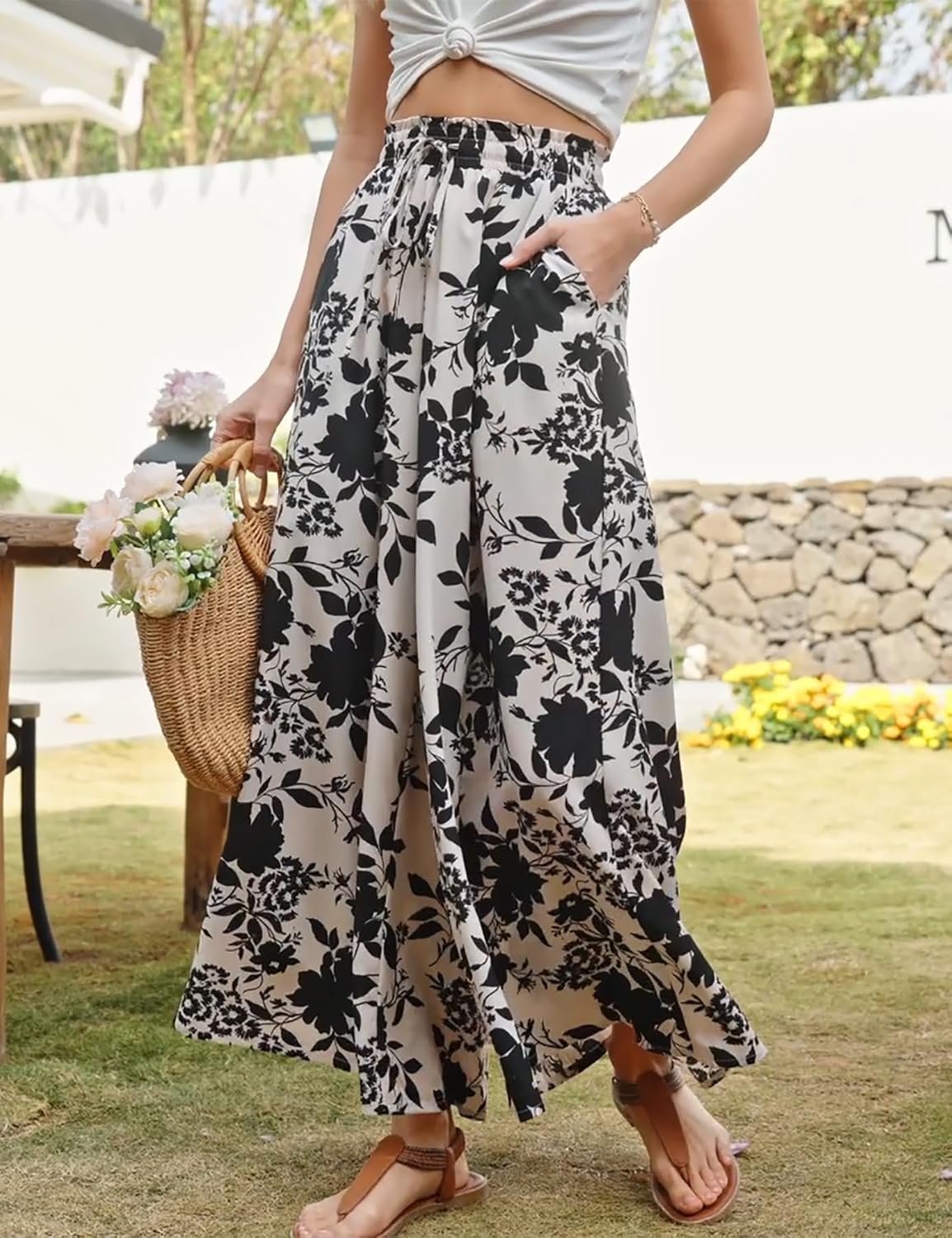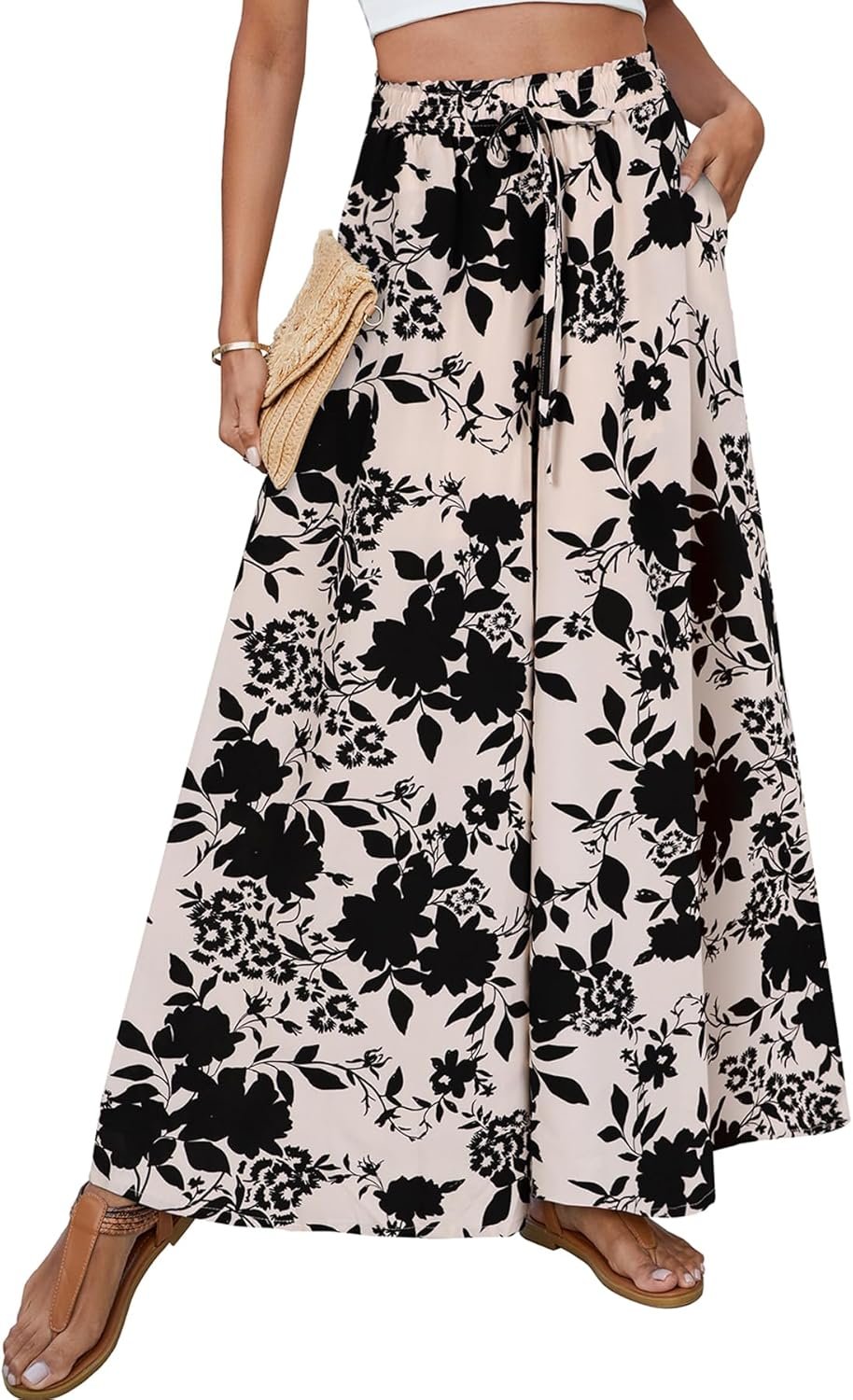 SimpleFun Women’s Palazzo Pants Boho Floral Wide Leg Trousers Summer Beach High Waisted Flowy Pants with Pockets