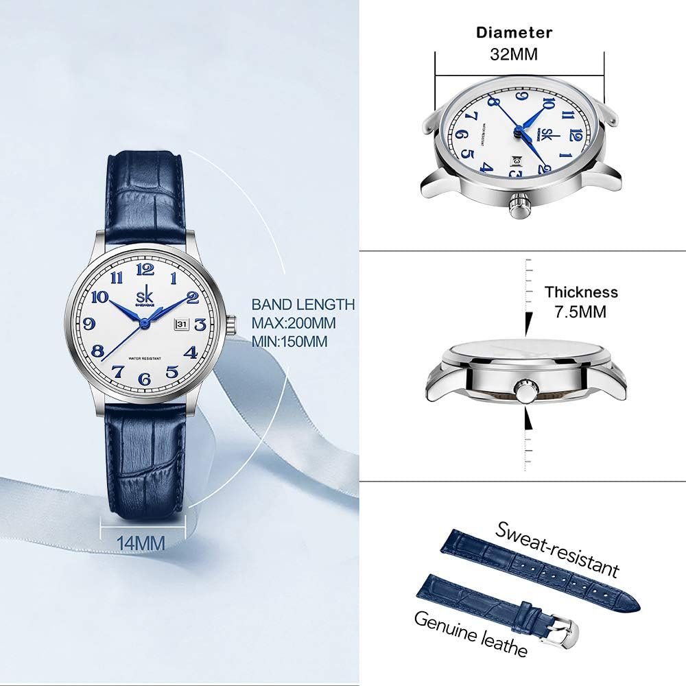 SK Classic Business Women Watches with Stainless Steel Band and Genuine Leather Elegant Ladies Calendar Watch