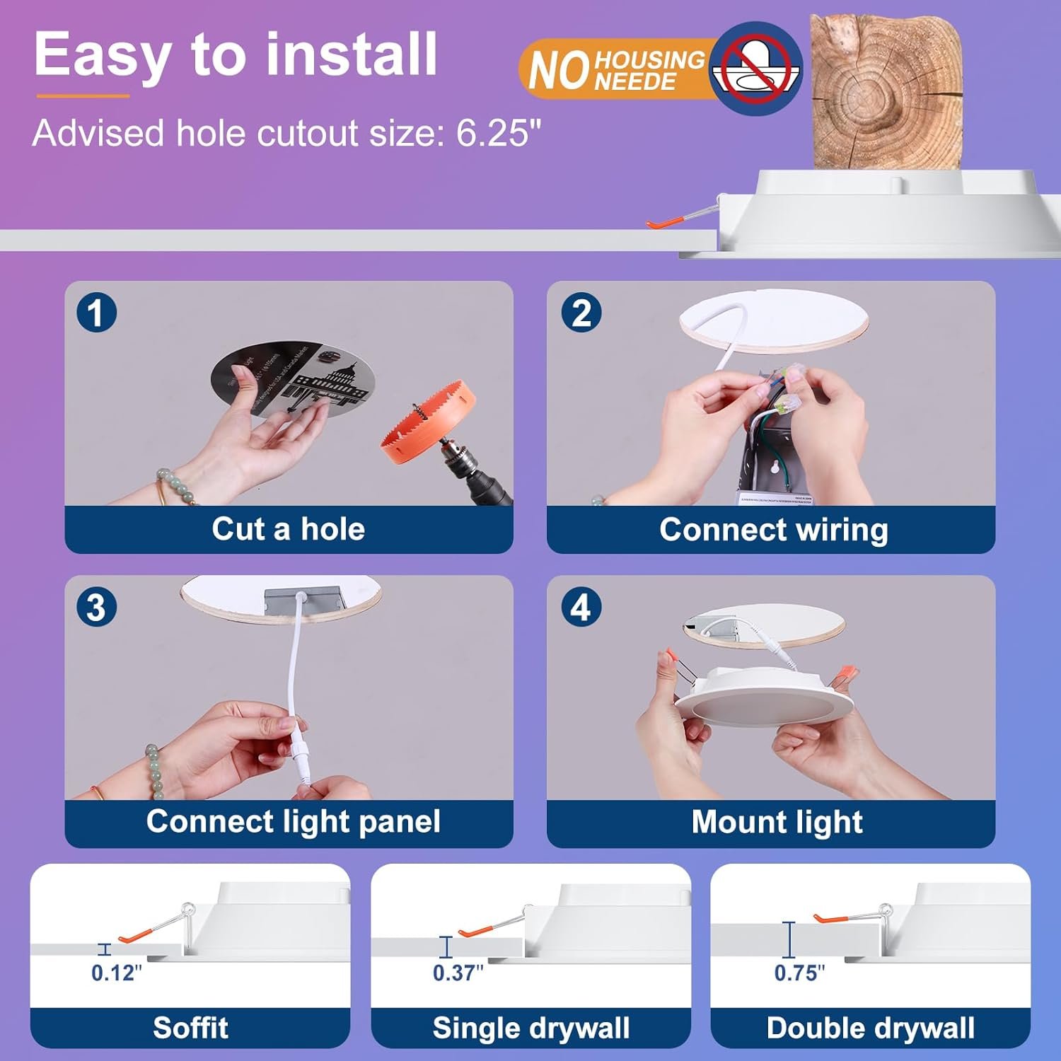 [Easy to install] The outer diameter of the LED downlight is Ø6.25in,Ceiling cutout: 5.7-6.2in,the suitable installation depth: 1.57in, the installation is convenient and safe. It is suitable for installation and use in different places , such as home,hotel,coffee shop, restaurant,Bar,game room,etc.