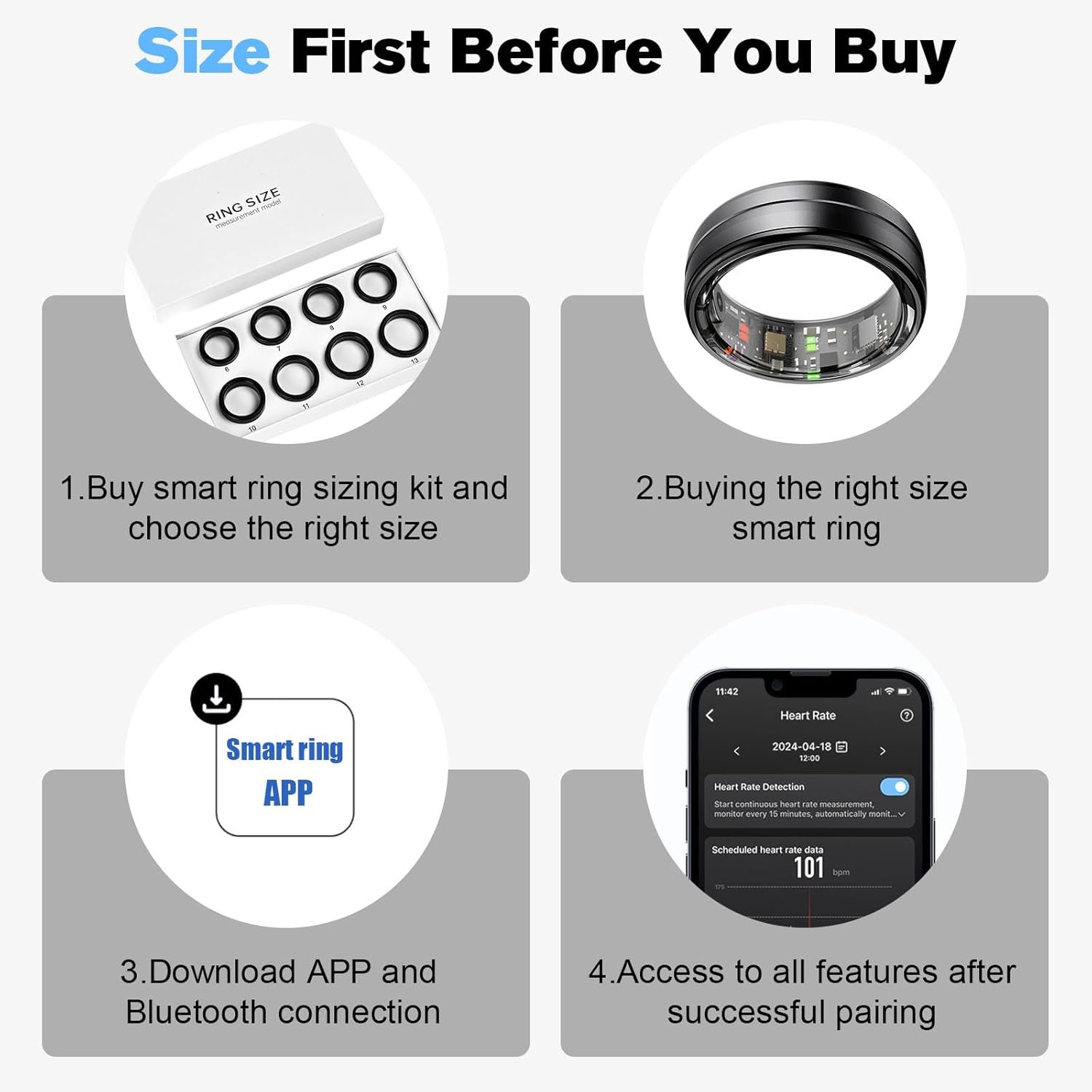 MEASURE BEFORE BUYING: This smart ring is a standard ring size When you are not sure of your ring size, you can buy the sizing kit first, this kit will help you choose the most suitable ring size for you.