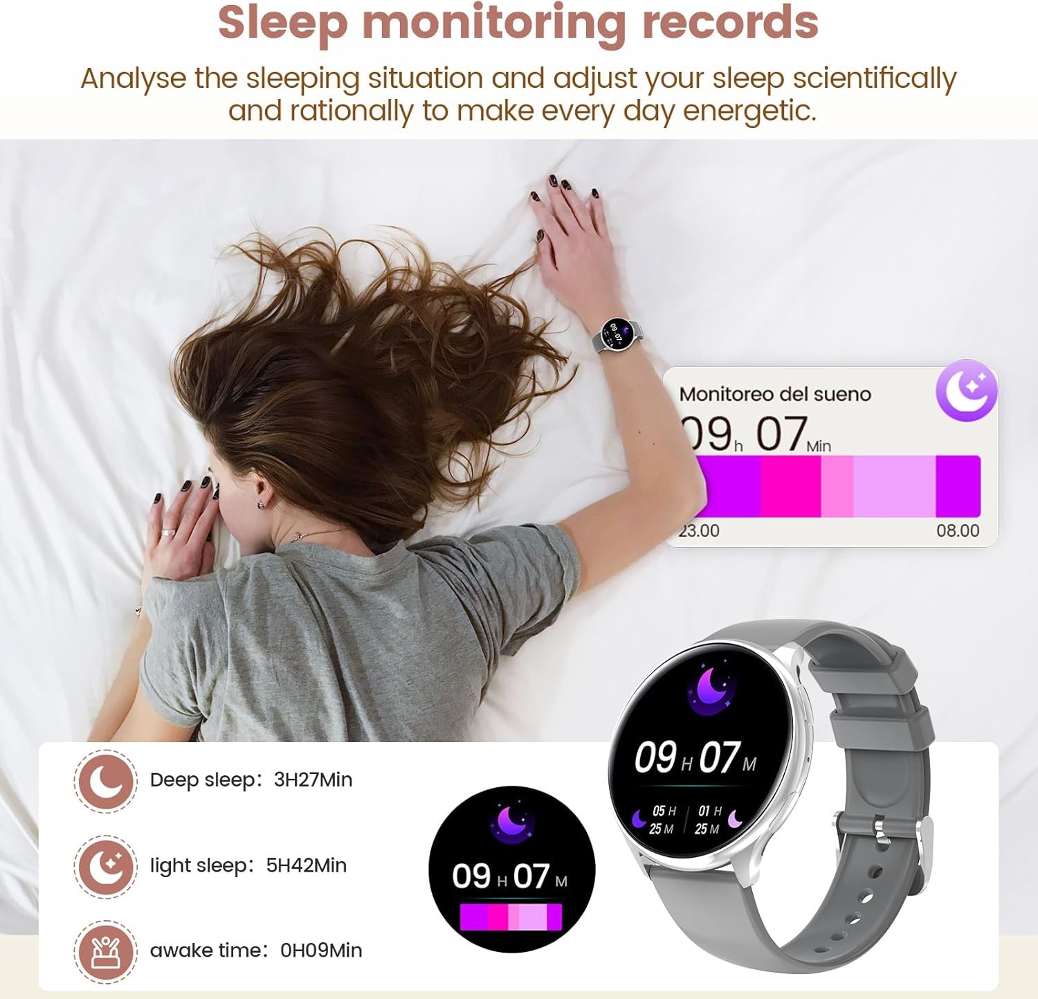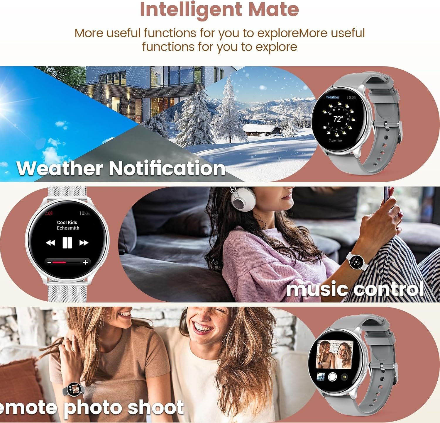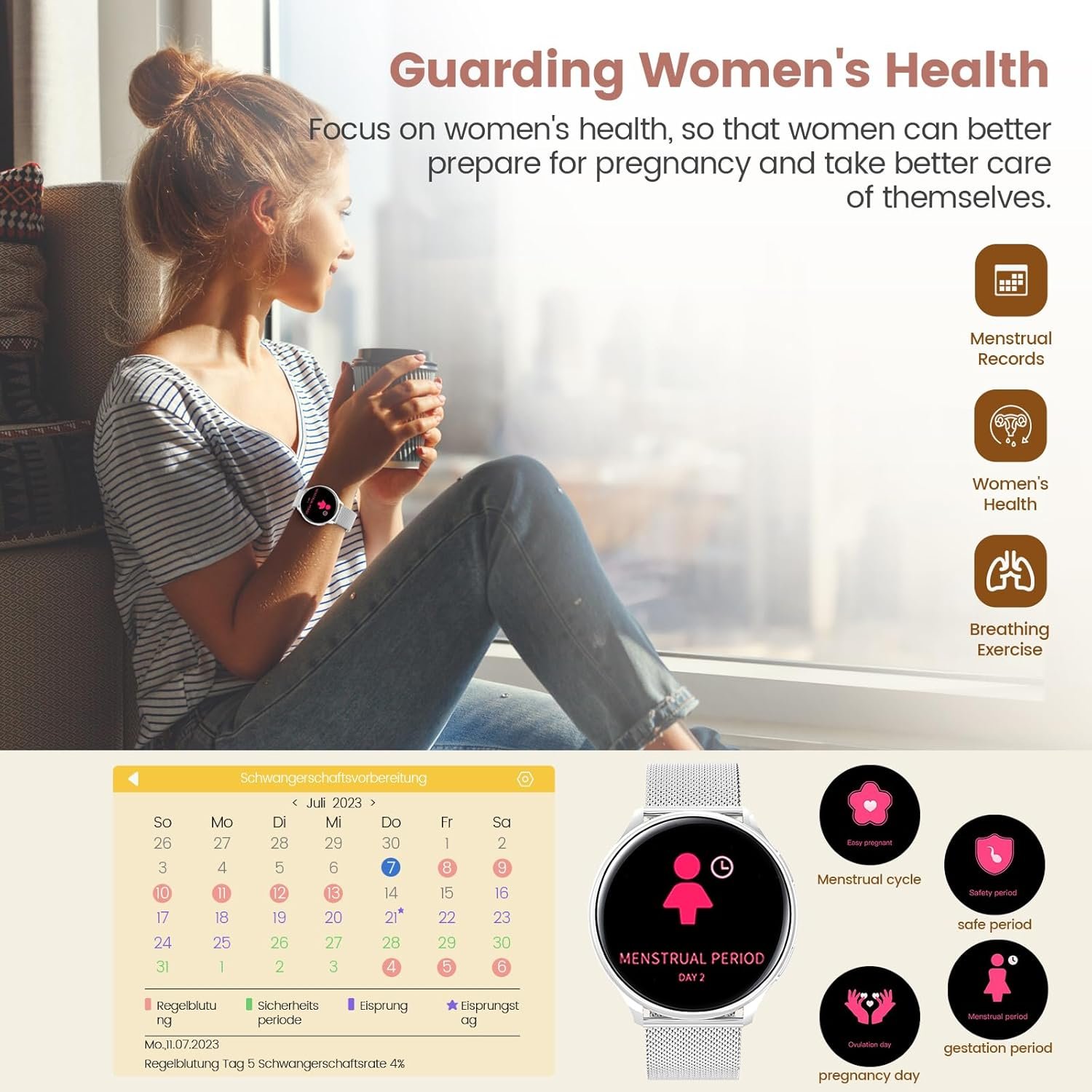 Attention to Women’s Health Protection : The new smart watch for women can monitor real-time heart rate, measure blood pressure and blood oxygen levels, automatically record sleep and many other functions. There is also a menstrual cycle tracking function that helps women predict and record their period and ovulation for better care and more accurate preparation for a successful pregnancy and delivery