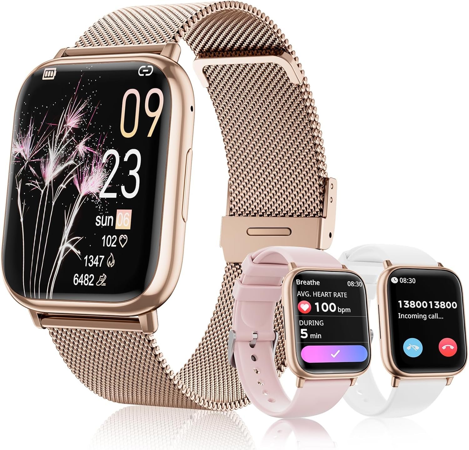 【Stylish Customization for Every Occasion】Elevate your style with 3 interchangeable bands (rose gold metal/Pink/White) and 200+ dial designs. Personalize this women’s smartwatch by uploading photos to create unique watch faces, blending fashion and tech seamlessly in any setting