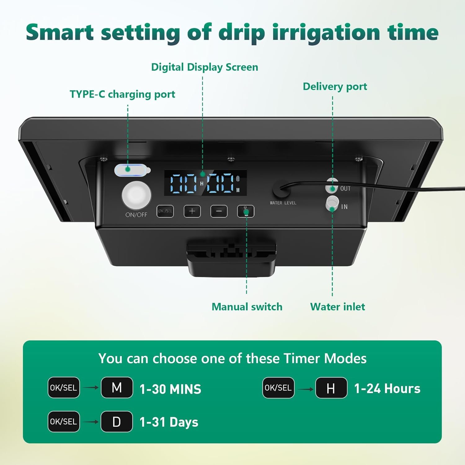 ⏰[Customizable Watering Schedules]: You can customize the watering schedule for your solar powered drip irrigation system according to your needs, this outdoor indoor gardening watering system has only one on/off button and one mode (OK/SEL) button, which allows you to set up a specific watering schedule. Cycle through 1620 timed watering options (1-30 minutes every 1-24 hours or every 1-30 days). Automatically water your plants, so you can program the system to water your plants at the optimal time, even when you’re not around.