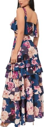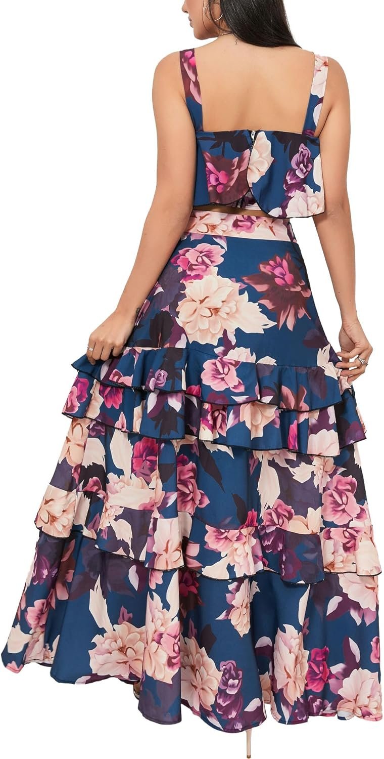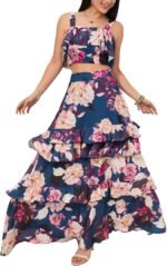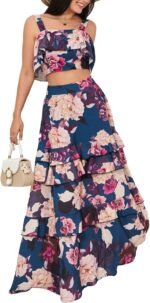 SOMTHRON Women’s Summer 2 Piece Outfits Floral Print Strap Crop Tops Tiered Ruffle Skirt Sets Maxi Long Dress