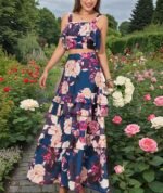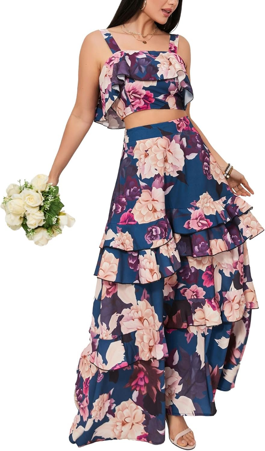 Our summer two piece outfits designed with floral printed, strap crop tops, sleeveless, tank top, ruffle tiered layered maxi skirt, flowy swing hem, boho style. Highlight your figure and add your glamour. Make you more stylish and sexy. Best gift for your friends or yourself this summer!
