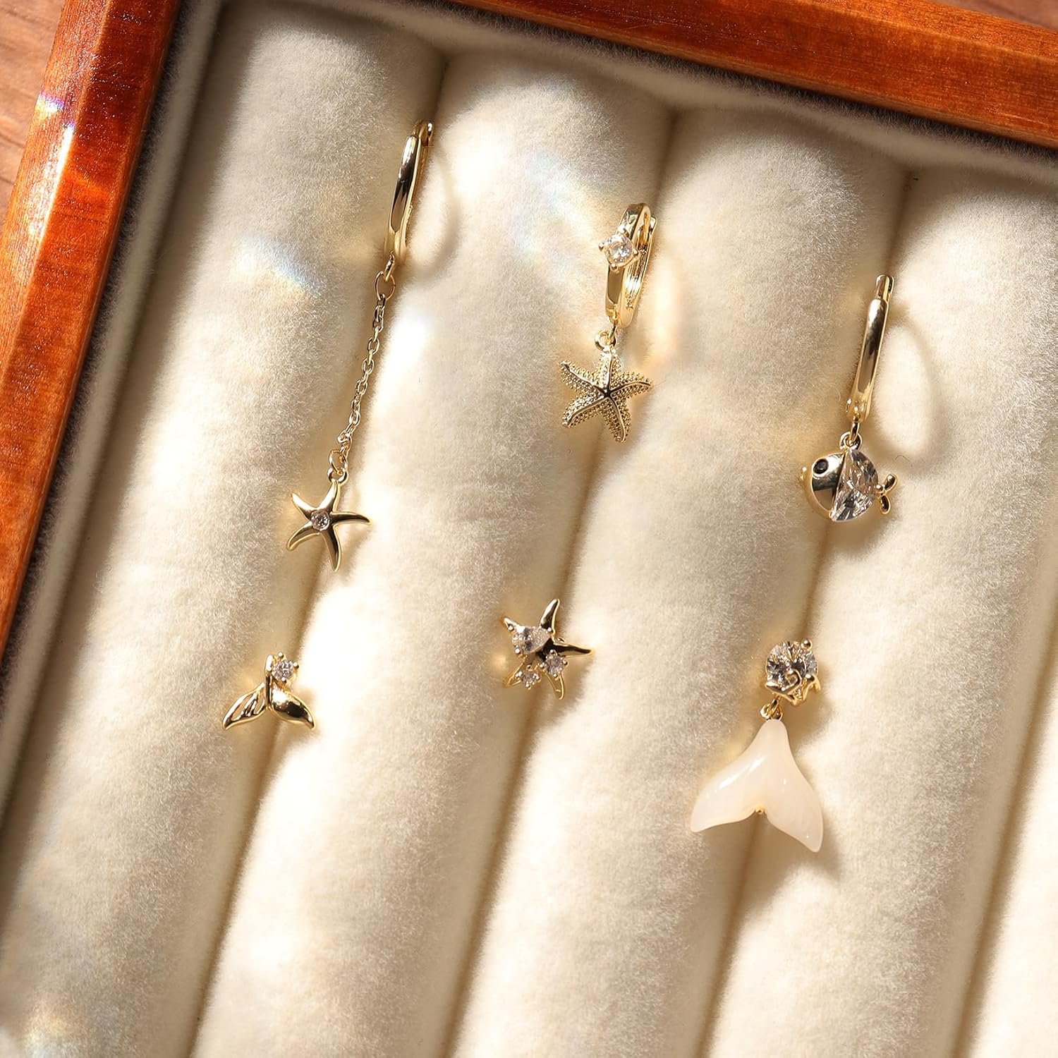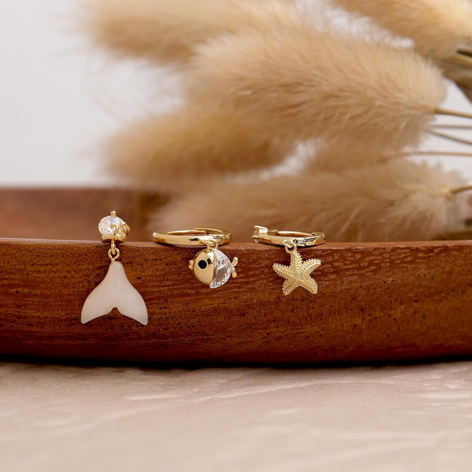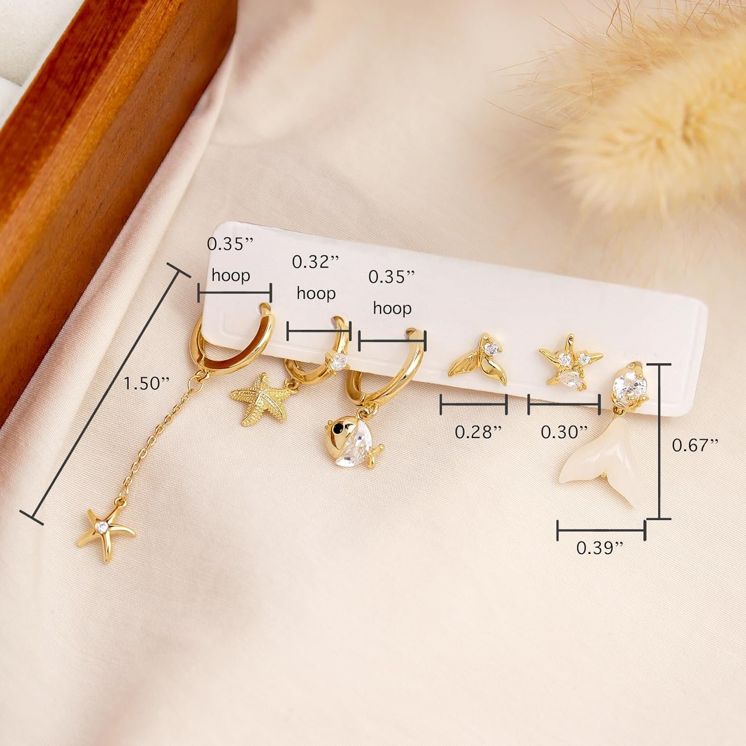 Sonateomber Dainty Gold Starfish Fishtail Fish Star Rhinestone Hoop Dangle Stud Earrings Stacks Set for Women, Cute Small CZ Hypoallergenic Cartilage Huggie Drop Earing Fashion Jewelry Gift