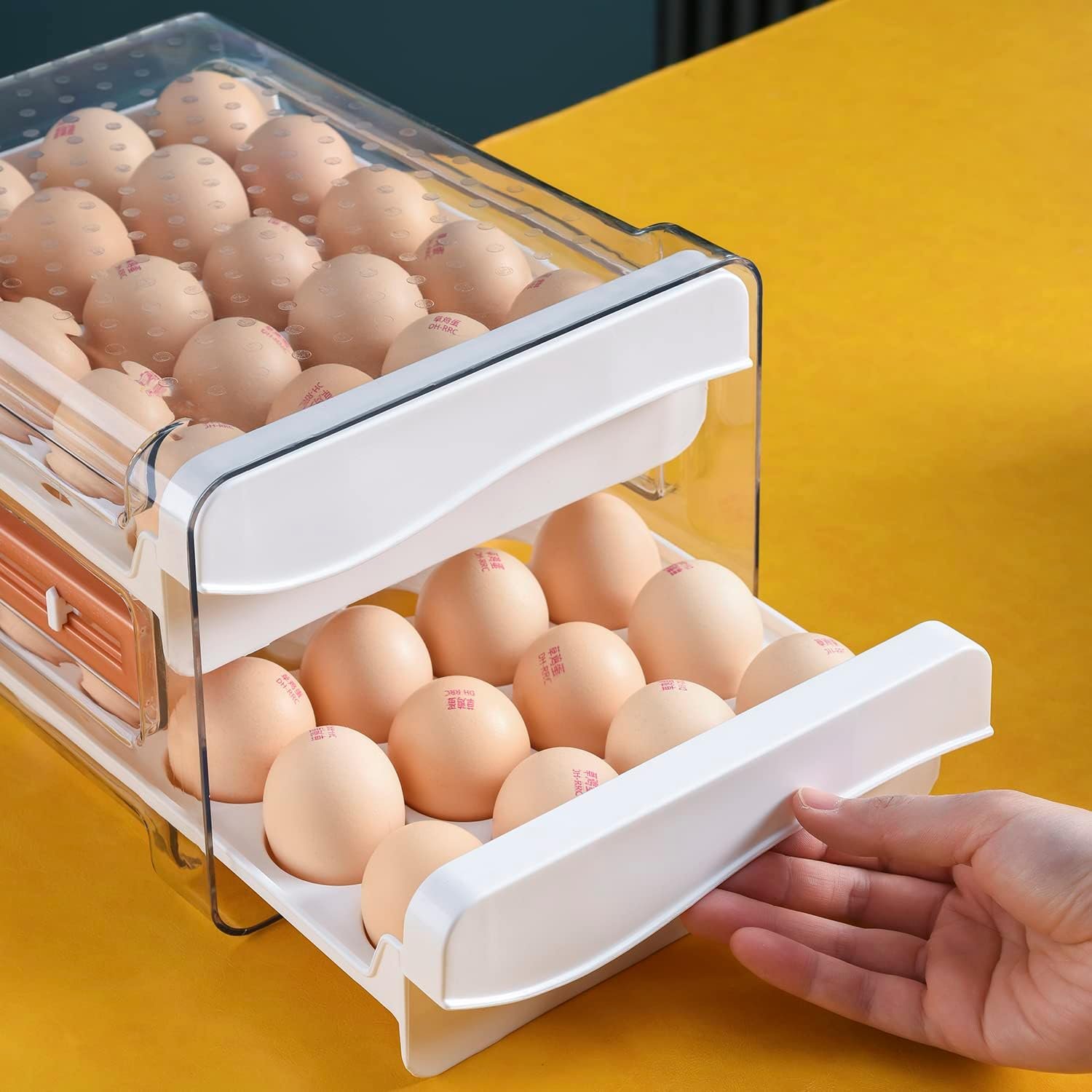 40 Grid Egg Holder:Double layer drawer design, can store 20 eggs per layer,free storage and more space saving Egg tray fixing, groove design, each egg is placed separately, prevent shaking, effectively prevent the egg from colliding and breaking.