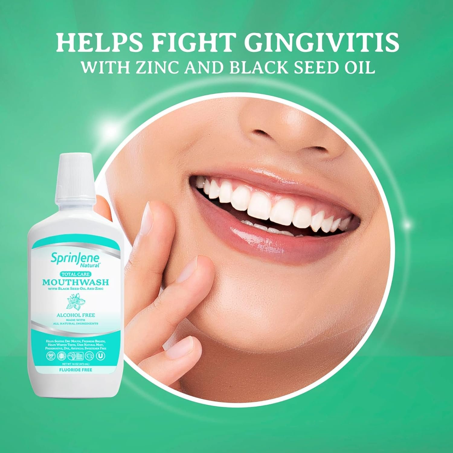 𝐆𝐞𝐧𝐭𝐥𝐞 𝐆𝐮𝐦 𝐂𝐚𝐫𝐞 & 𝐈𝐧𝐟𝐥𝐚𝐦𝐦𝐚𝐭𝐢𝐨𝐧 𝐑𝐞𝐝𝐮𝐜𝐭𝐢𝐨𝐧: SprinJene Mouthwash, Alcohol-Free, safeguards Gum Health, reducing Inflammation and Plaque formation with its potent blend of Natural Ingredients, including Xylitol, Black Seed Oil and Zinc, for Happy, Healthy Gums.