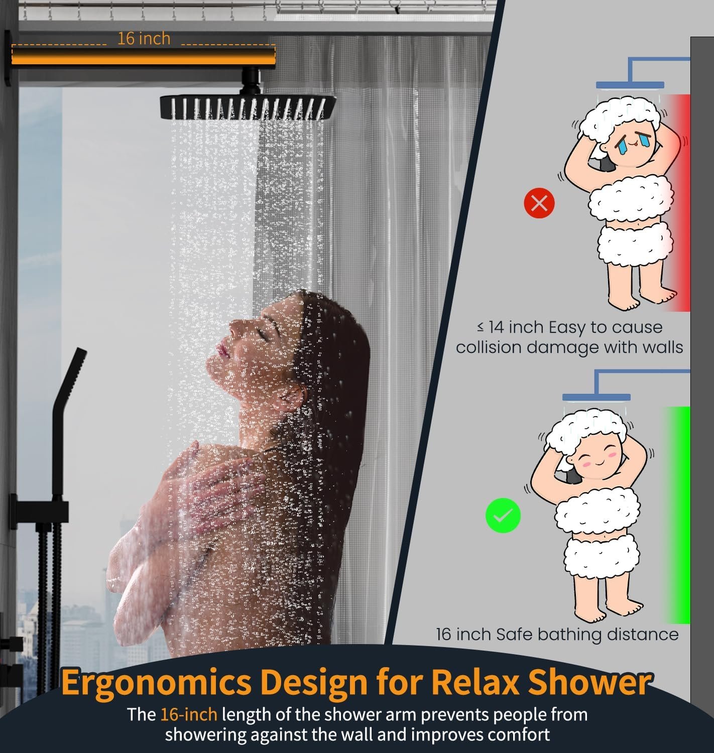 Complete Shower System Included: This shower faucet set includes everything you need for a luxurious upgrade: a 10-inch rain shower head, a handheld shower head, a 71-inch shower hose, a 16-inch shower arm, a handheld bracket, a mixing valve, a panel, a handle, a mode knob, shower arm and bracket covers, and all necessary installation accessories.