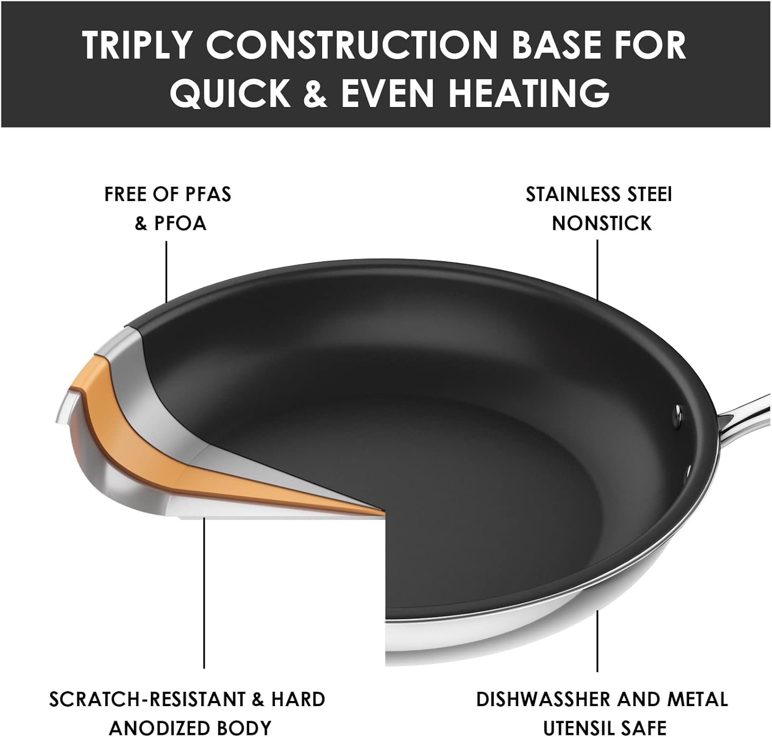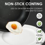 Healthy nonstick coating: 100% PTFA, PFOA, cadmium free, ideal for use with little oil or butter for a healthy diet. Conduct heats quickly and evenly across the surface of the nonstick skillet set and slips onto the plate once ready.