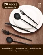 20PCS BLACK FLATWARE SET FOR 4 – Including 4 dinner knives, 4 dinner forks, 4 dinner spoons, 4 salad forks, and 4 teaspoons. Perfect for any occasion, from everyday family meals to joyous gatherings and formal banquets. Create cherished memories during candlelight dinners, celebrate holidays like Thanksgiving with elegance, or elevate your BBQs and weddings to a new level of sophistication.