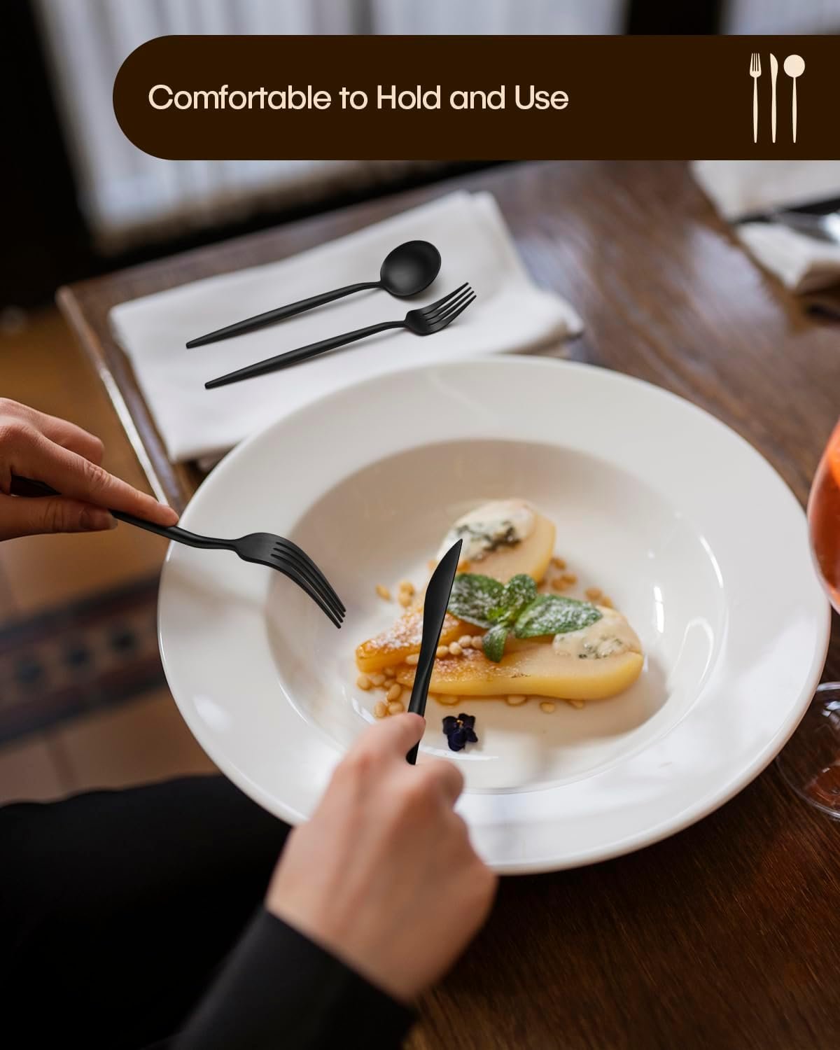 FOOD GRADE STAINLESS STEEL – Our matte black silverware is made of premium stainless steel, it offers nice resistance to rust and corrosion to get the most sturdy and healthy experience while using, and never bends in daily use, much better than the cheaper ones. You will be well impressed by the good quality from the first sight of it.