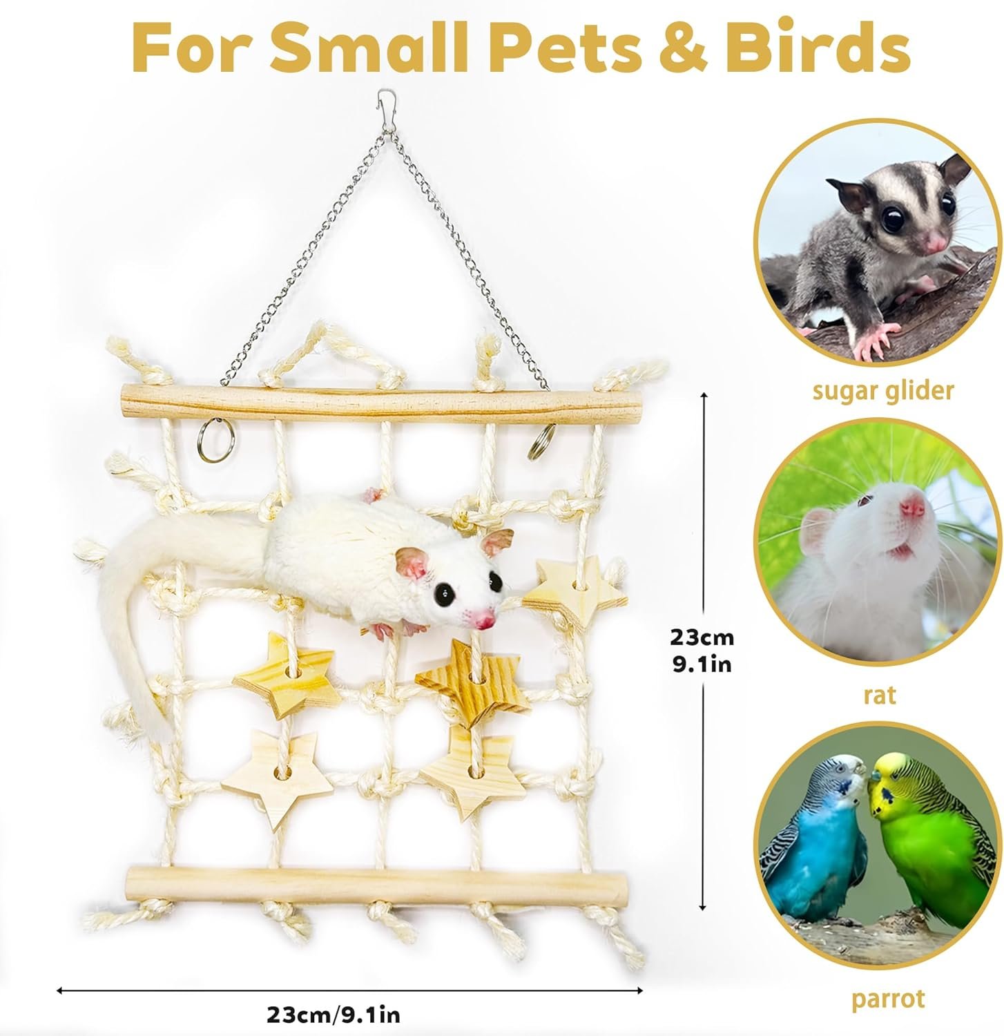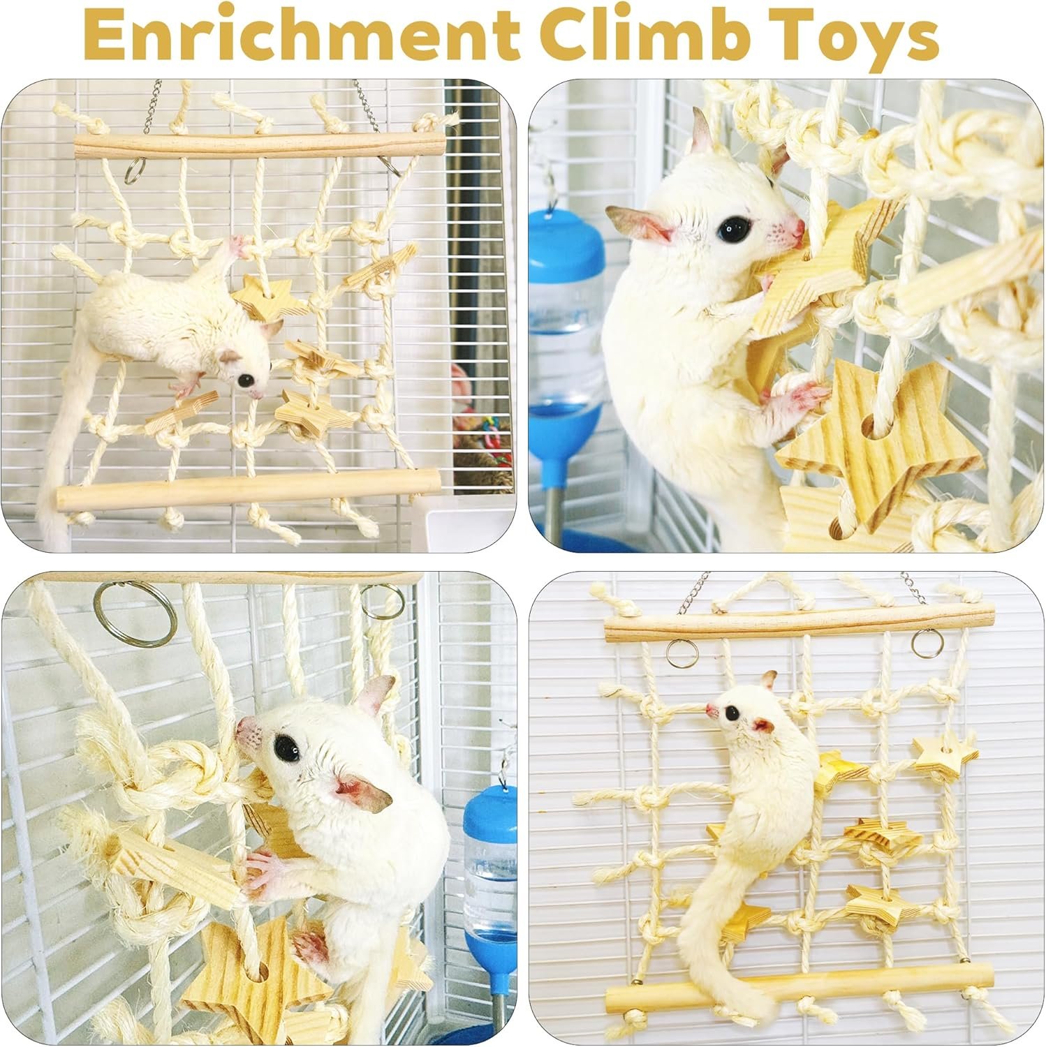 Sugar Glider Toys, Natural Wooden & Sisal Sugar Glider Climbing Net, Hanging Toys Rat Cage Accessories, Anti-Snag Chew-Resistant Small Pets Enrichment Toy for Rats, Parrots and Budgies