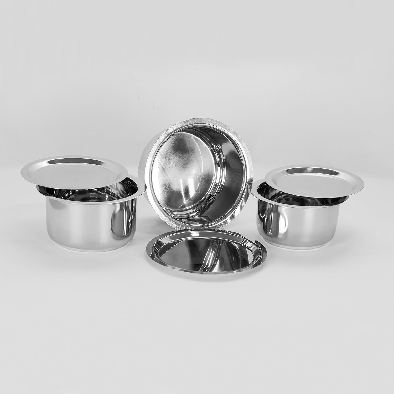 Features: Induction friendly cookware. Will work on gas stove also. Good quality. Made with good quality stainless steel. Flat bottom. Energy efficient, heats evenly and cooks faster. Easy to clean. Set contains collection of tope / vessels of various sizes, hence taking care of all your kitchen needs. Compaq size makes it easy to store in kitchen cupboards. When not in use, stack the smaller container inside bigger containers saving storage space.Specifications: Set of 3 flat base container / tope / deep vessel for kitchen with lids