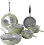 Sur La Table Kitchen Essentials 10 Piece PFA Free Non-Toxic Titanium Ceramic Nonstick Interior Forged Aluminum Cookware Pots and Pans Set – Green – Induction Compatible