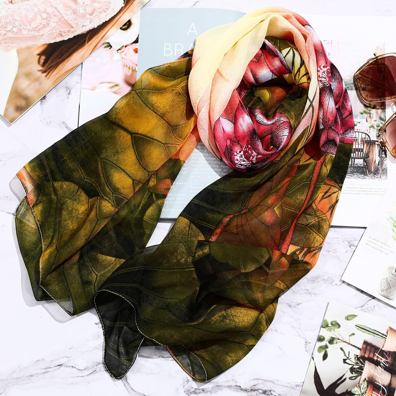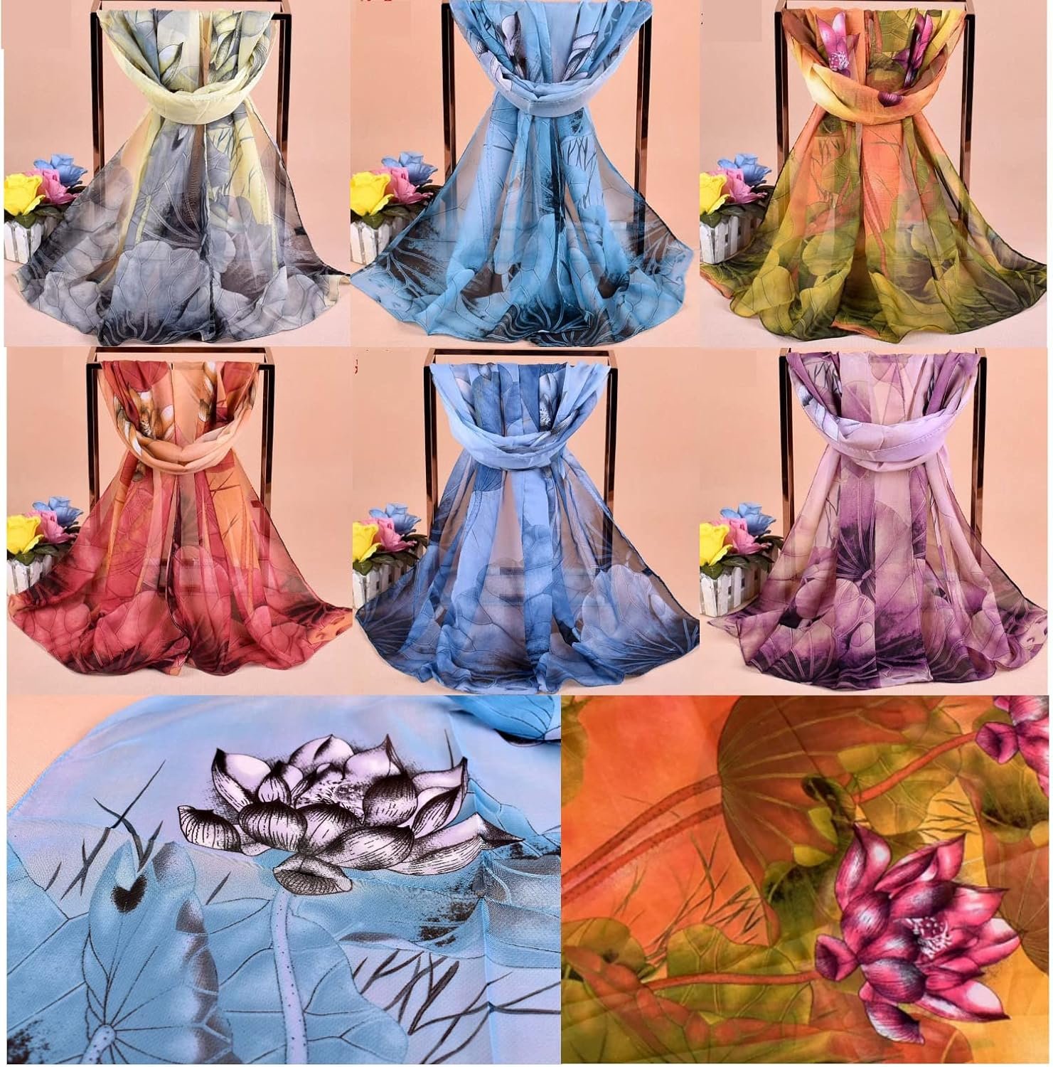 Customers appreciate the beautiful colors, silky texture, and good quality of these scarves. They find the appearance nice, lightweight, and sheer with lovely patterning. The scarves feel good on the skin and are the right size for all-day wear. Customers also like the scarf size and value for money.