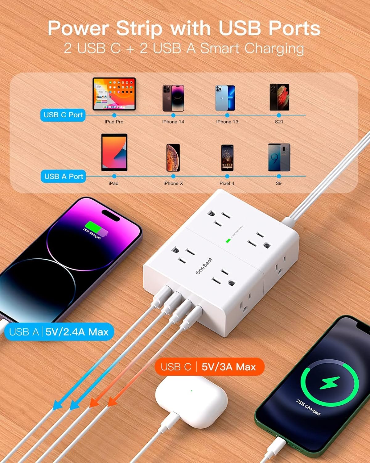 Upgraded One Beat Power Strip added 2 USB-C ports to meet more charging demand. USB-C port can up to 15W/5V/3A max which is up to 30% faster than other chargers.