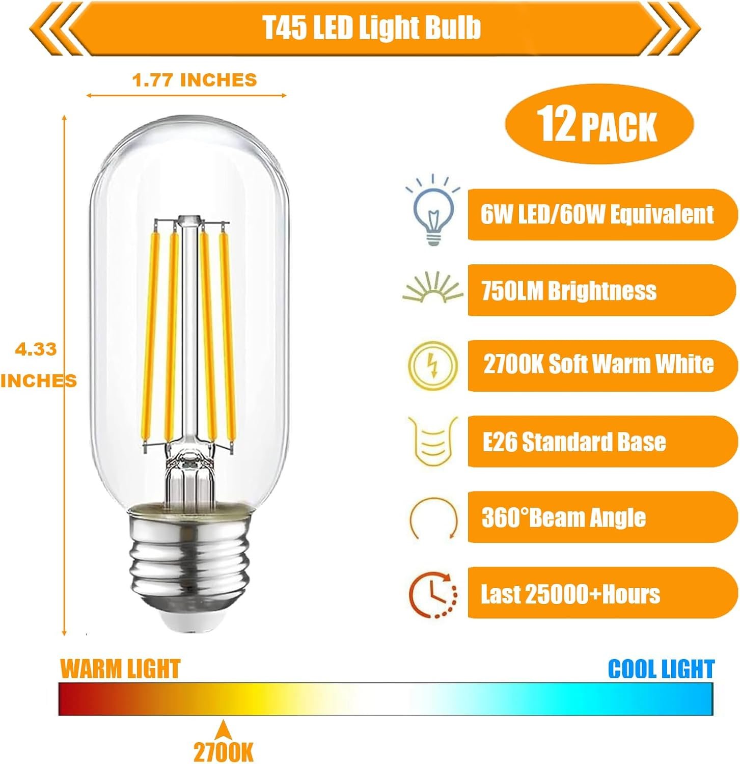 Technical Features: T45 led filament tubular light bulb, E26 Base, 120v 60w lightbulb, clear standard light bulbs, soft warm white 2700k, 750 lumens, 360 degrees beam angle