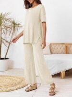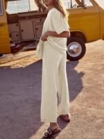 Tankaneo Women’s 2 Piece Travel Outfits Casual Short Sleeve Knit Sweater Set Wide Leg Pants Lounge Sets Tracksuit