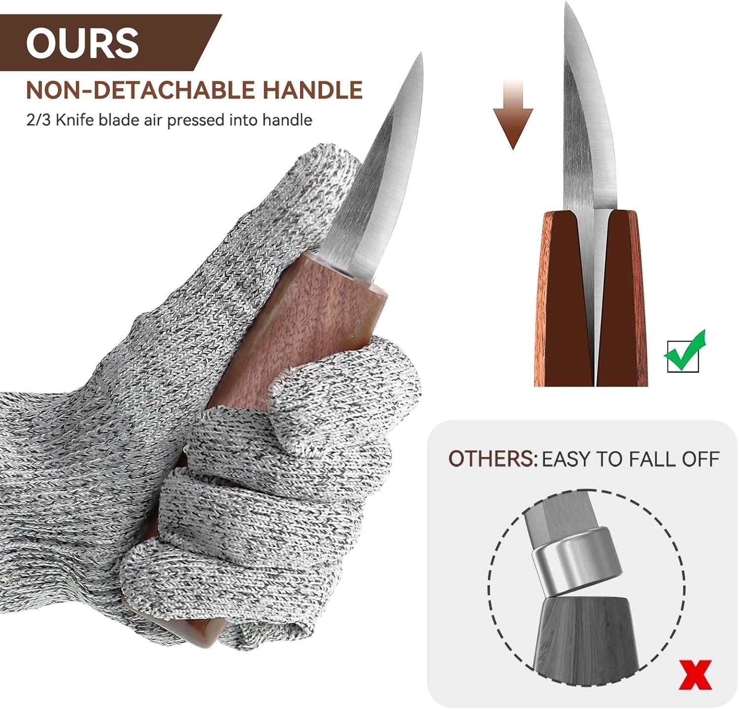 Durable Wood Carving Knife: The blade is made of sharp hard carbon steel blade, high strength and hardness, it features excellent edge performance, razor sharpness, and exceptional corrosion resistance, it can keep knives edge sharp and not curl after several wood carving, easy to carve