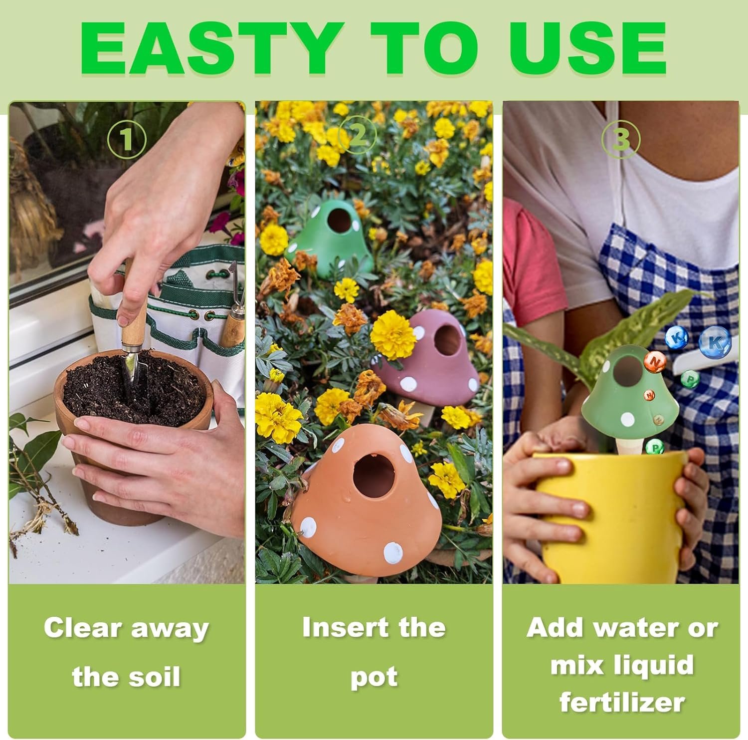 【 Two Steps To Use】 First,you only need to fill it with water.Second,insert the sharp part of the self watering spikes into the plant pot.You can also fill it with the Nutrient solution to make your plants grow well.