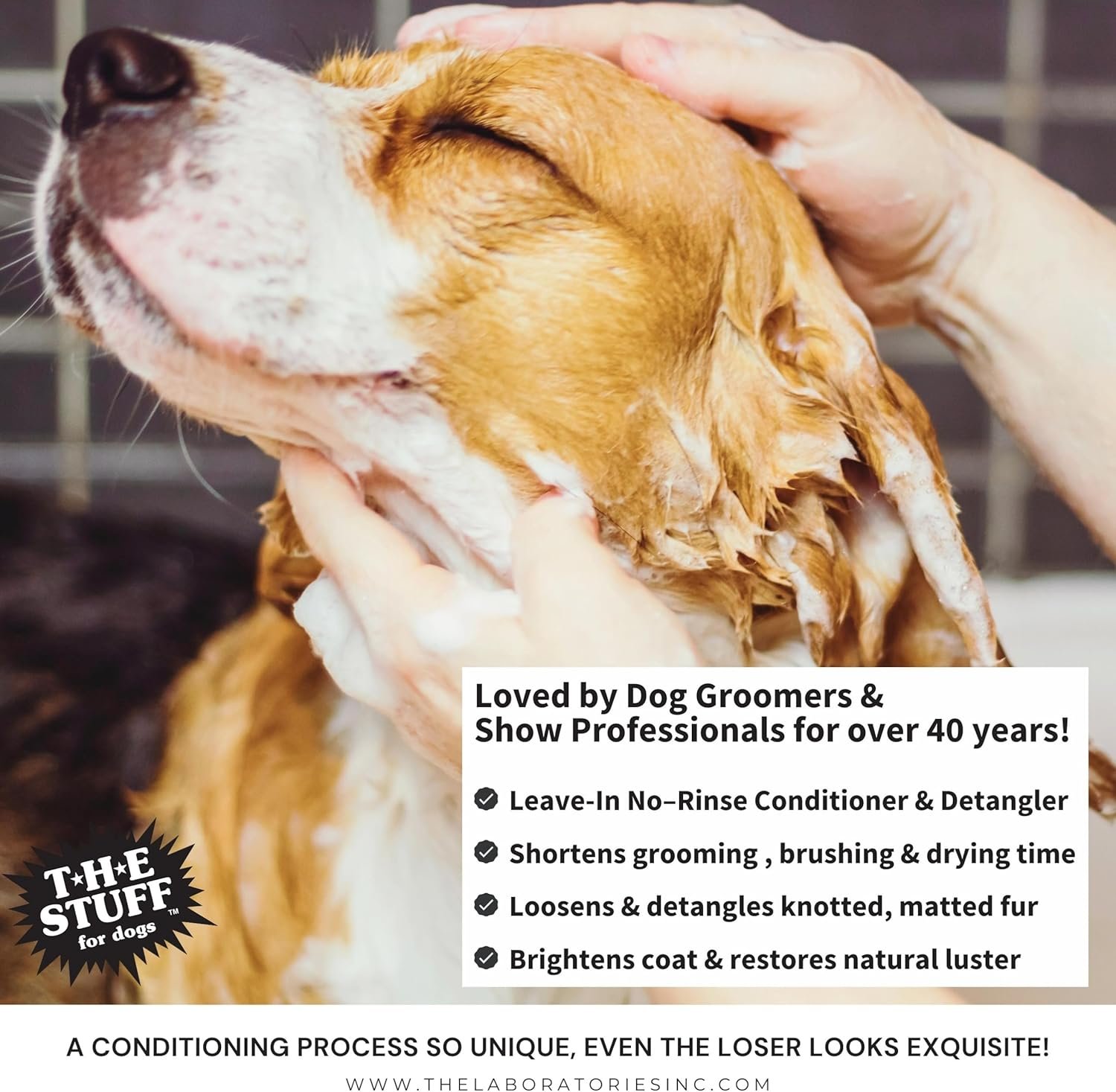 FOR BEST RESULTS The Stuff Leave-In Conditioner and Detangling Spray works best when applied to the wet coat. After bath, spray a small amount of The Stuff into dog’s