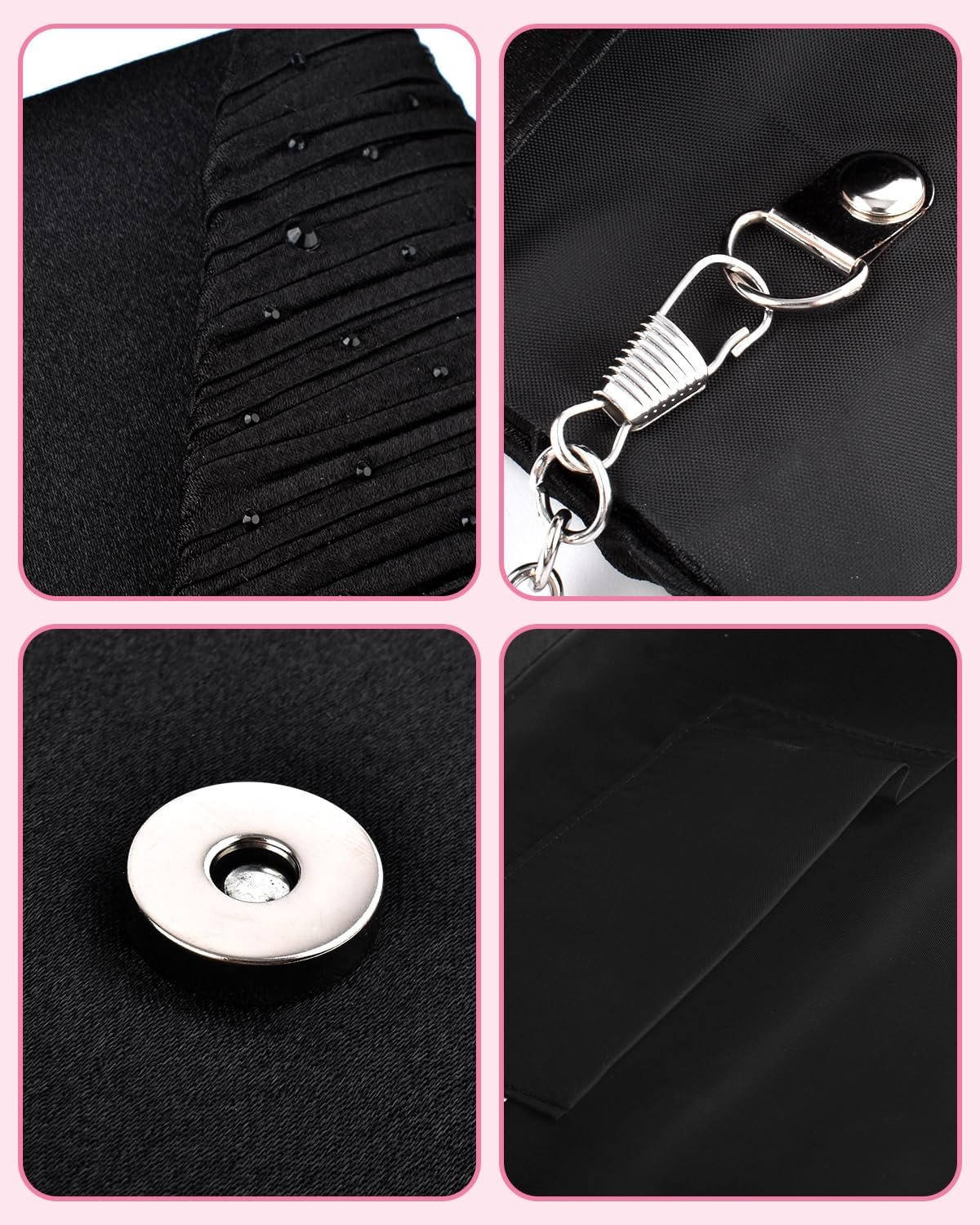 Materials: Made from frabic with shimmer material, magnetic snap closure.