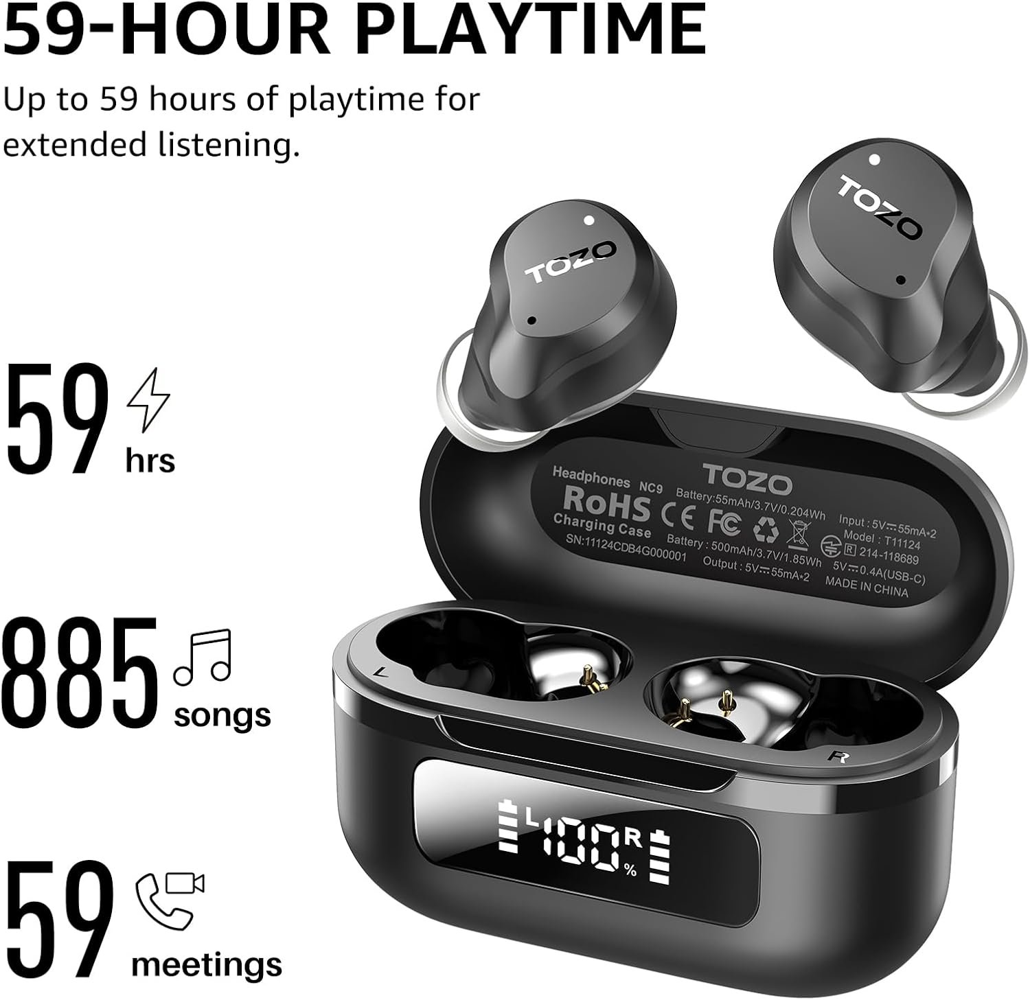[Upgrade your Playtime with the NC9 2024] The charging case not only serves up to 59H(ANC off) and 42H(ANC on) totally playtime after 2 hrs fully charge, and 14hrs(ANC off) and 10hrs(ANC on) playback for single use. It also displays the remain battery, ensuring it’s still there when you need it most.