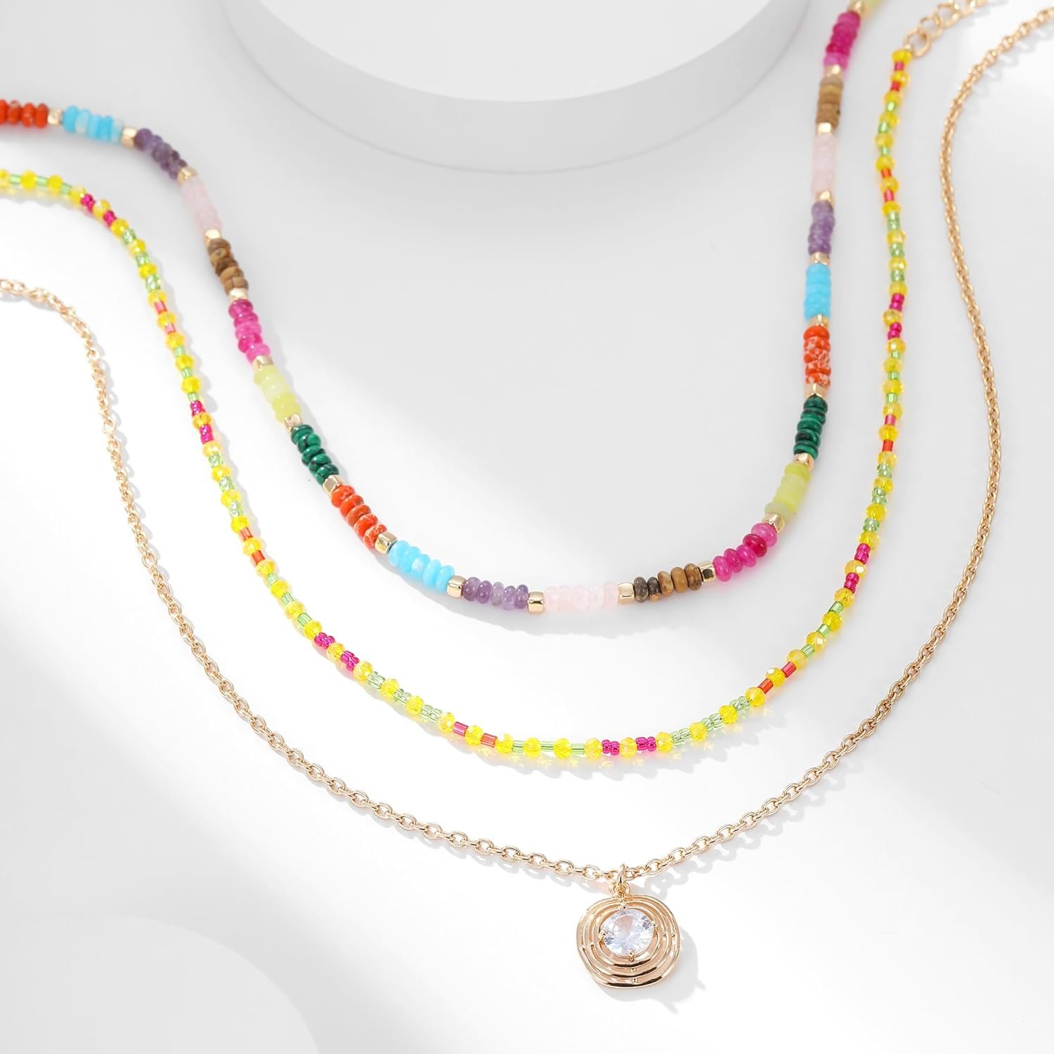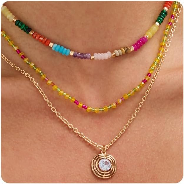 Trendy Layered Necklaces Set for Women Gold – toned Chain Sparkling Crystal Pendant Necklace, Colorful Beaded & Natural Stone Separable Multi – layer Necklace