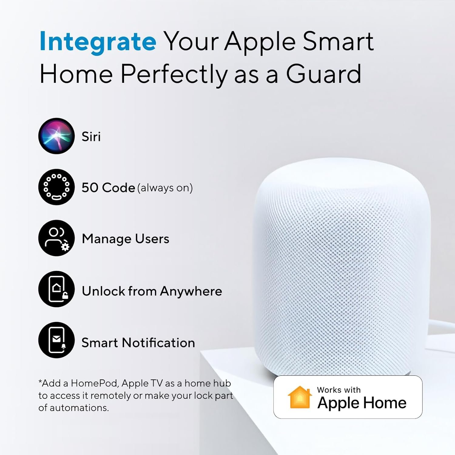 【Apple Home Support】ULTRALOQ’s first-ever Apple Home fingerprint smart deadbolt is a smart lock that is fully integrated into Apple Home. It can be unlocked with the Apple home app by using an iPhone or Apple Watch. Moreover, you can share access for your guests. Just add a HomePod, Apple TV, or iPad as a home hub to make your lock part of automations or control it remotely with Siri.
