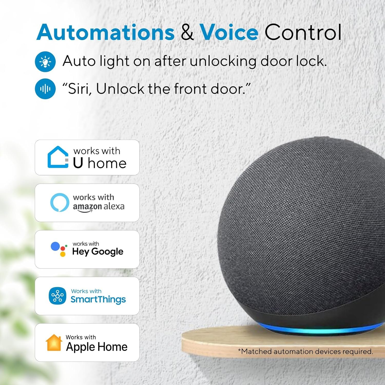 【Automations with U-Home and Third-Party Devices】The Bolt F Smart Door Lock is works with third-party ecosystems like Alexa, Apple Home, Google Home, Smartthings, IFTTT as well as the U-home app, Voice control with Siri, Alexa and Google Assistant. It can be used to automate your smart home by pairing multiple U-home smart products through the U-home App. For example, when you come home and unlock the smart lock, the smart bulb will automatically light up.