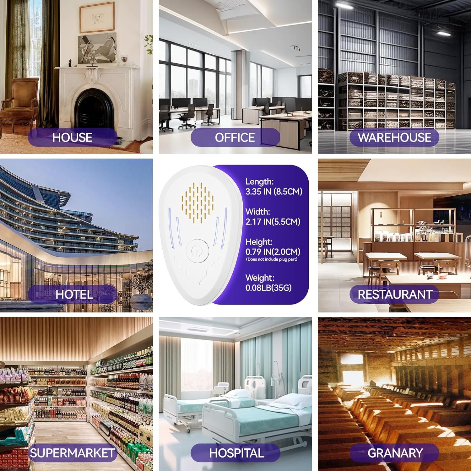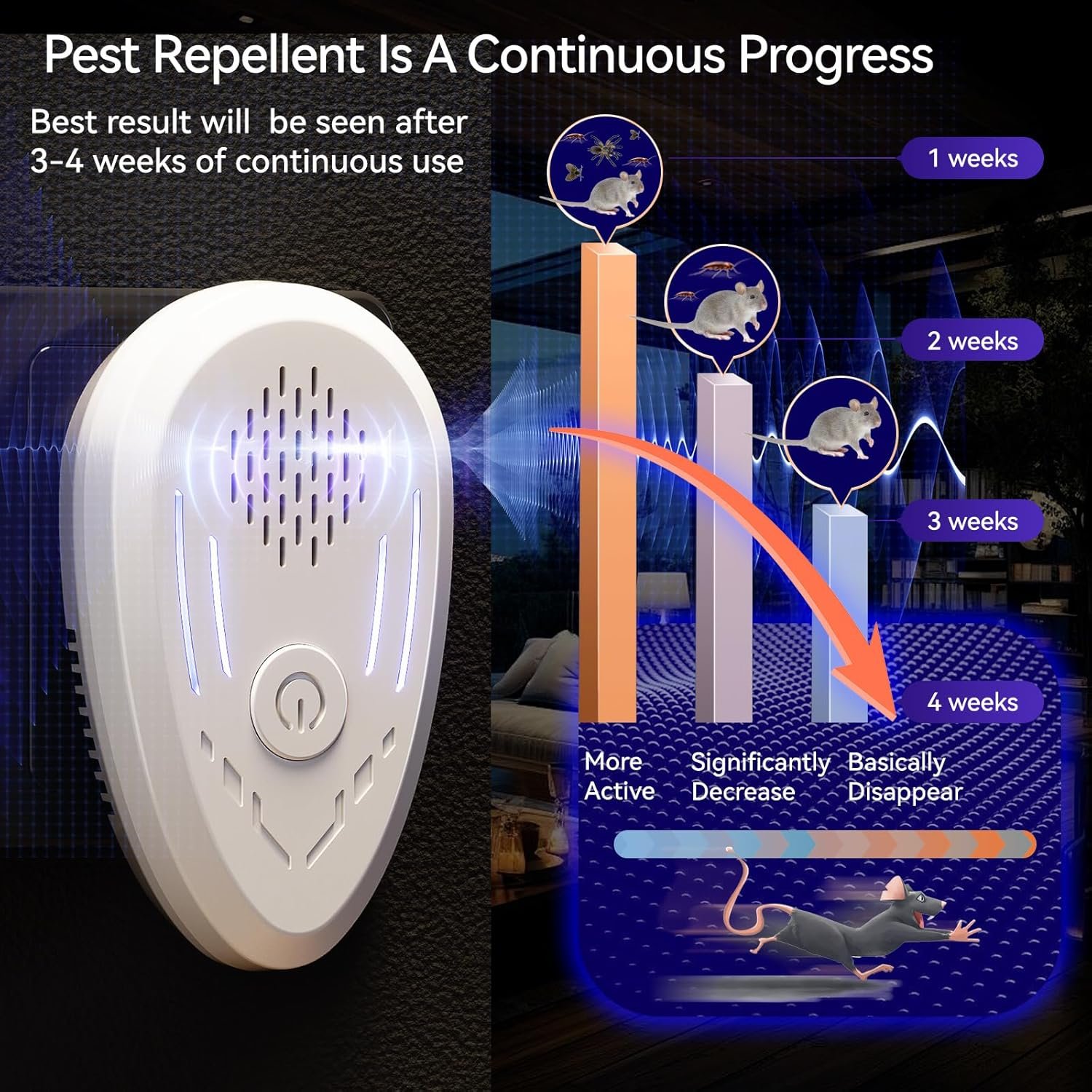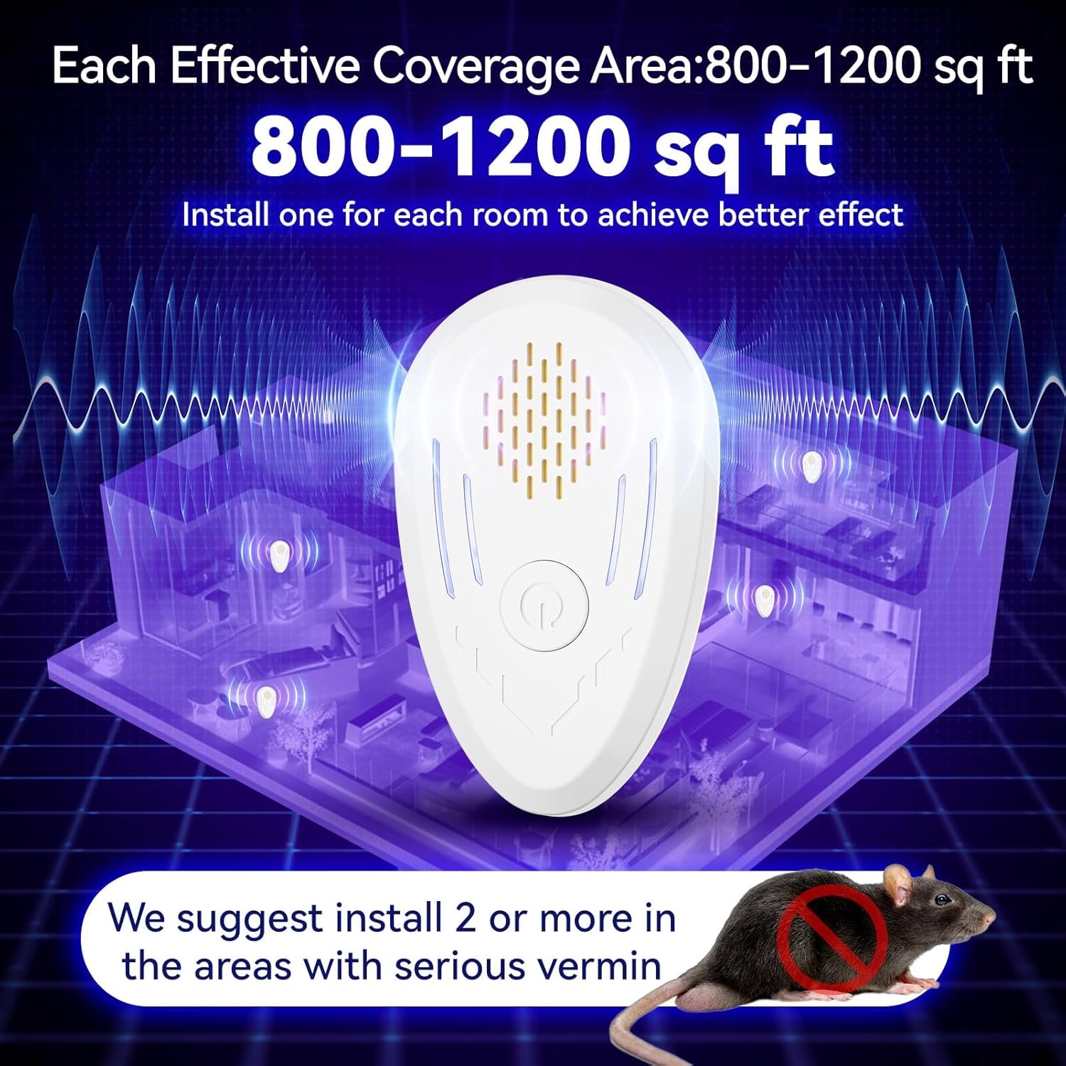 Friendly To Human And Pets: Unlike traditional repelling methods, this ultrasonic repeller does not produce substances and odors that are harmful to humans and pets. By emitting ultrasonic waves that are inaudible to humans and pets, but audible to pest mice, they numb the nerve centers of pests and mice and repel pests. Protect human and pets, and create a safe and healthy living environment